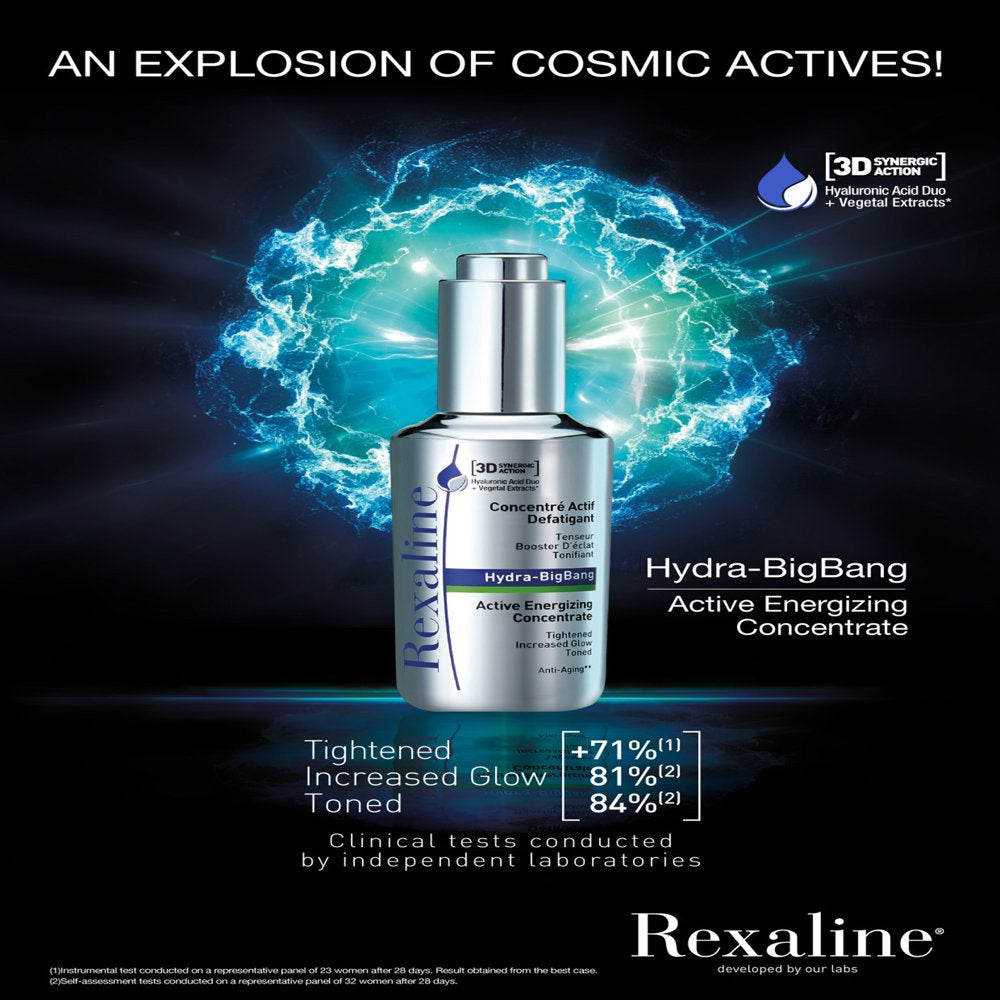 A real shot of ENERGY! Rexaline 3D Hydra-BigBang is a revolutionary serum that combats visible signs of fatigue caused by stress, a lack of sleep, emotional imbalances and more. It reduces imperfections and rebalances the skin for the long term. The Olivine stimulates cell renewal and combats environmental stress, while the Cassava Root Extract has an instant smoothing and lifting effect. The Hyaluronic Acid Duo in the exclusive Rexaline Complex is enriched with two powerful hydrating plant actives, Red Algae and Desert Rose. The skin is gradually rebalanced, toned up for the long term and signs of fatigue ease. You'll love the light, non-sticky texture which instantly melts into the skin to leave it feeling fresh. You'll love the subtle, fleeting scent that doesn't affect your skin's pH.