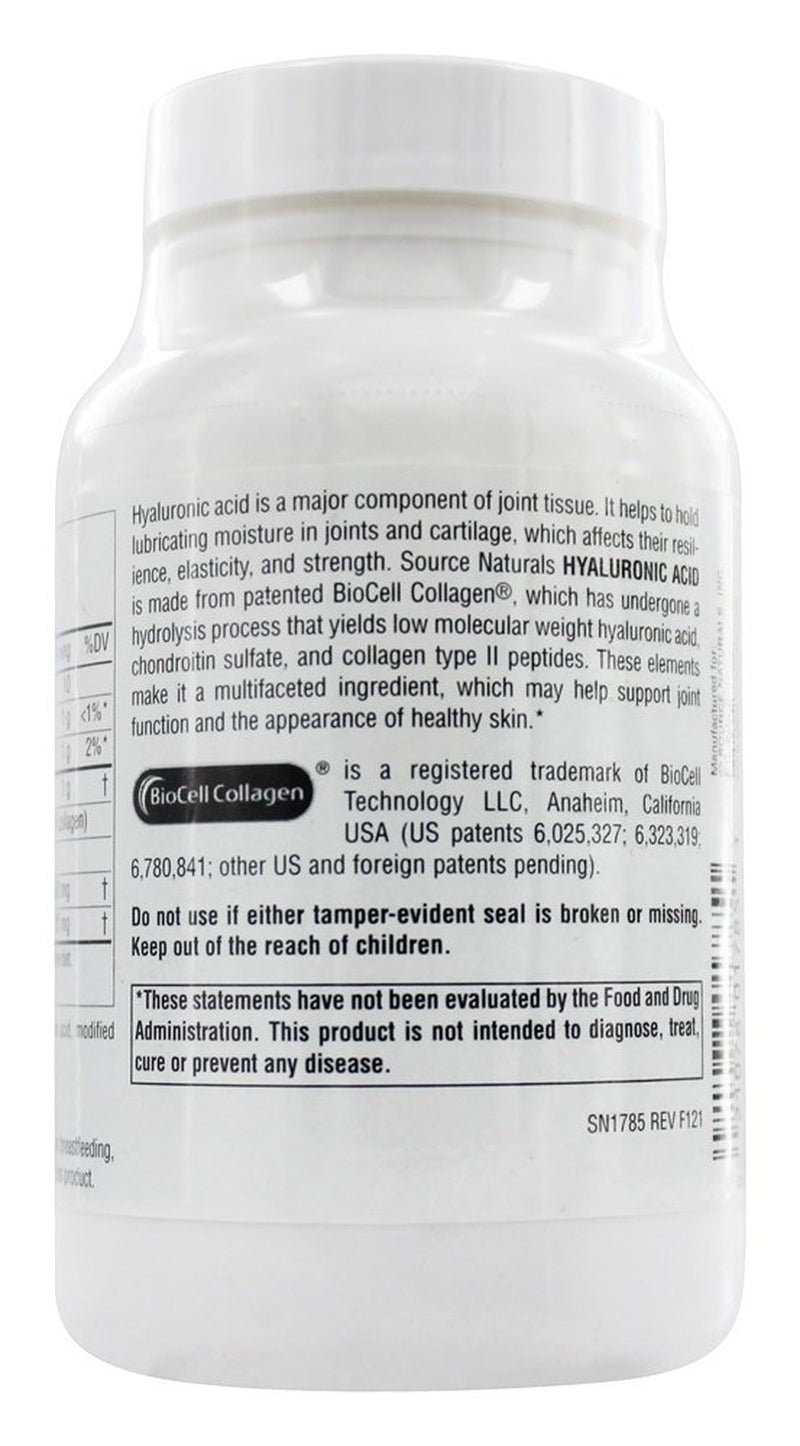Hyaluronic Acid, 50 mg, Tablets 120 tablets Dietary supplement. Promotes healthy joints. Hyaluronic acid is a major component of joint tissue. It helps to hold lubricating moisture in joints and cartilage, which affects their resilience, elasticity, and strength. Source Naturals Hyaluronic Acid is made from patented BioCell Collagen II, which has undergone an absorption enhancing hydrolyzation process that yields low molecular weight hyaluronic acid, chondroitin sulfate, and Collagen Type II peptides. These elements make it a multifaceted ingredient, which may help support joint function at the appearance of healthy skin. (These statements have not been evaluated by the Food and Drug Administration. This product is not intended to diagnose, treat, cure, or prevent any disease.) Contains no yeast, dairy, egg, gluten, corn, soy or wheat. Contains no sugar, starch, salt, artificial color, flavor or fragrance. 2 Tablets twice daily, or as recommended by your health care professional. If you are pregnant or breastfeeding, consult your health care professional before using this product. Do not use if either tamper-evident seal is broken or missing. Keep out of reach of children. 120 tablets Scotts Valley, CA 95066 Source Naturals, Inc.