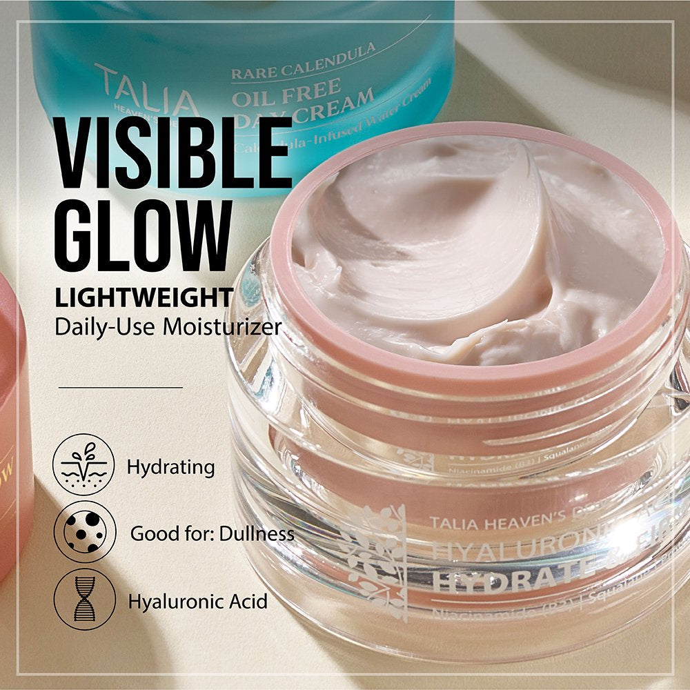 VISIBLE GLOW FIRMING Moisturizer: An ultra-lightweight firming cream that infuses thirsty skin with 2% Hyaluronic acid, potent Peptides, Rose oil, and Vitamin E complex to visibly boost radiance and glow. A Firming Cream for women or men who want to fix dryness, dullness or loss of firmness of the skin.,LONG LASTING HYDRATION: Our Firming mask Targets fine lines and deep wrinkles and by doing so minimizes fine lines and wrinkles. Improves skin firmness and elasticity while strengthening complexion and glow. Gives long lasting hydration and brightens your appearance.,Visible Glow firming Formula: This firming mask infused with Hyaluronic Acid and Peptides complex, is also enhanced with Vitamin E to refresh hydration, smooth texture, and visibly brighten the appearance for a healthy-looking glow. firms, improves skin texture and visibly reduces fine lines and wrinkles.,100% VEGAN. Clean & effective Moisturizer formula authentically free from a long list of ingredients including Sulfates, SLS, and SLES Phthalates, Propylene Glycol, Mineral Oil, DEA, Parabens, Petrolatum, Animal Ingredients, and more. Always formulated for fabulous results without irritation. 100% Allergens-Free, mild-Delicate Scents.,About Talia: CLEAN SKINCARE WITH RESULTS. Creating lightweight creams and serums for Immediate Absorption of Treatment. Talia Heaven s Dew METHOD: We create clean & natural formulas enhanced by clinically proven bio-technologies and exclusive botanical blends. WHAT WE OFFER: Luxurious, light-scented products that bring results & are gorgeously pleasurable to use.