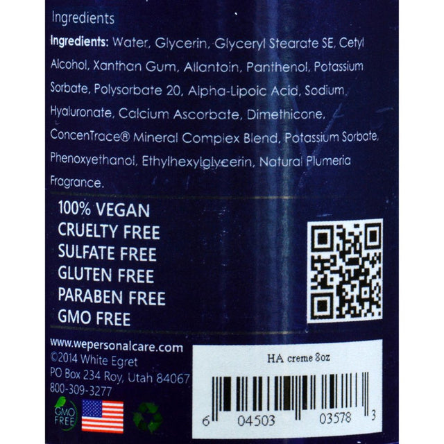 Hyaluronic Acid by White Egret INC 8 oz Liquid Hyaluronic Acid 8 oz Liquid This cream contains Hyaluronic acid day serum with alpha lipoid acid and sea minerals. It moisturizes skin and prevents the skin from anti aging keeping the skin fresh young and healthy. Ingredients Water glycerin glyceryl stearate SE cetyl alcohol xanthan gum allantoin panthenol potassium sorbate polysorbate 20 alpha-lipoic acid sodium hyaluronate calcium ascorbate dimethicone ConcenTrace mineral complex blend potassium sorbate phenoxyethanol ethylhexylglycerin natural plumeria fragrance. Moisturize Tighten Protect Firm Suggested Use As a dietary supplement Apply a small amount of Hyaluronic acid cream onto the fingertips and apply to the entire face and throat in light upward strokes. Use in the morning or whenever extra moisture is needed. May be used under make-up. - Or as directed by your healthcare professional. Does Not Contain Animal ingredients animal cruelty sulfate gluten paraben and GMO. Warnings Ke
