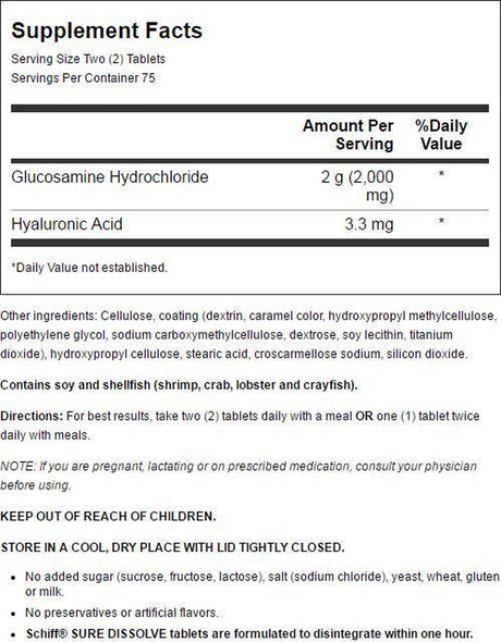 Schiff Glucosamine + Hyaluronic Acid Tablets, 2000 Mg. 150 Ct