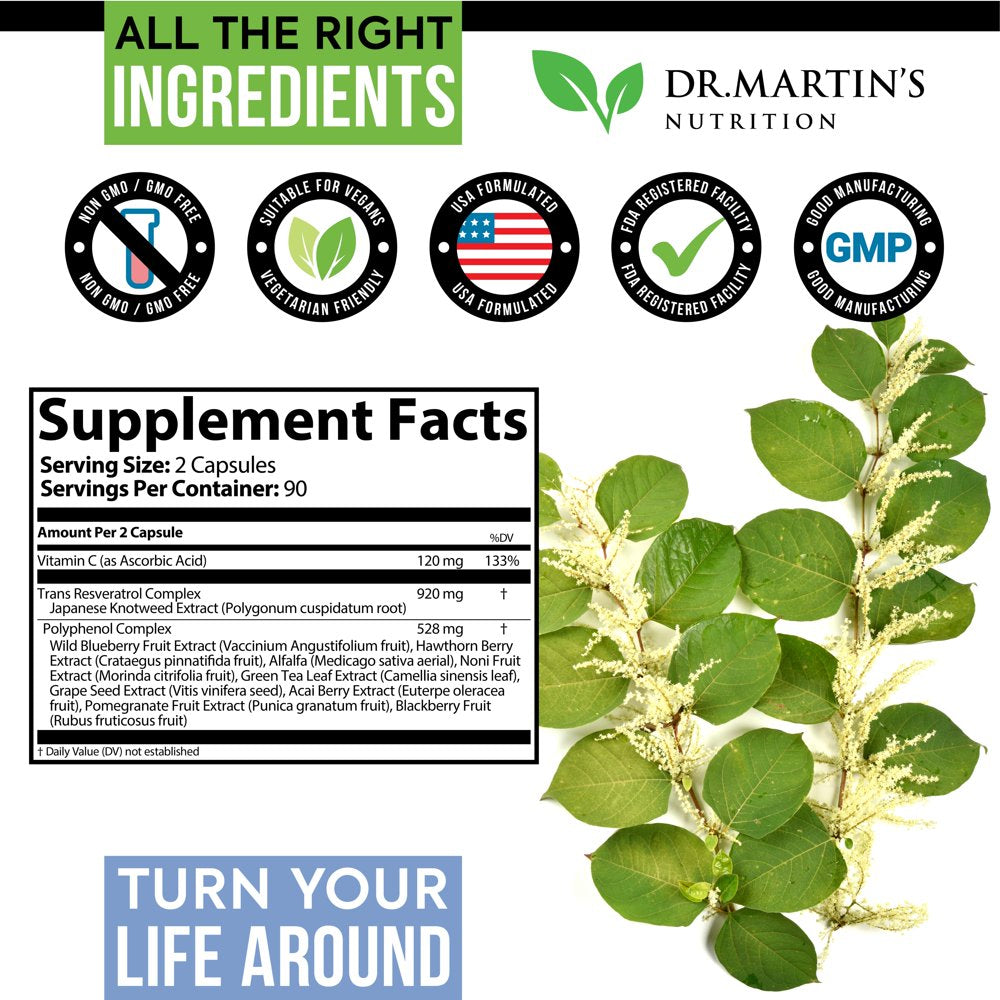 People say that drinking a glass of red wine a day is good for you. This is because of a certain antioxidant called Resveratrol that is found in grape skins, along with berries, peanuts, and certain other foods. It has many impressive benefits for your body and mind, which is why fitness experts continue to sing its praises. However, drinking too much wine is both impractical and potentially harmful. Here’s an easier, more efficient way of including this antioxidant in your diet. We ask a lot from our bodies: wake up before the sun... spend hours at work... run around with the kids... enjoy a night with friends (sometimes a little too much)... and our bodies can only take so much. Our cells begin to oxidize and wear away with every harsh request we ask. That's why we need the support of DR. MARTIN'S NUTRITION Resveratrol to increase our immune, brain, and cardiovascular function. Each 90 serving bottle fills our bodies with anti-oxidants, and with them, the anti-aging benefits to reduce the effects of all that we ask from our bodies.