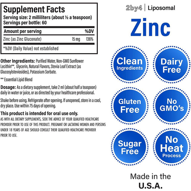 2By4 Zinc Liposomal Liquid Vitamin Supplement Immune Health 15Mg, 4 Fluid Oz