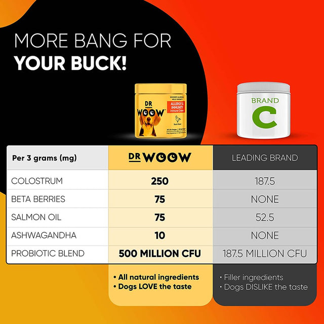 NATURAL DOG IMMUNE SUPPLEMENT: Delicious dog allergy immune bites that help with the immune system. Great functional formula to be used as allergy chews for dogs itch relief, immune support for puppies and dogs, and overall health.,BETTABERRIES ANTIOXIDANT BLEND, VITAMIN E, COLOSTRUM: Help support your dogs immune system with the combination of salmon fish oil that provides omega 3, vitamins and Colostrum that help support allergies and immune functions and dog allergy relief.,PREBIOTIC AND PROBIOTIC BLEND DOG ALLERGY CHEWS: These dog allergy supplement feature a powerful Prebiotic from Yea-Sacc and apple cider vinegar and six strains of Probiotics that supports nutrient absorption to help pet digestion and boost the immune system.,TASTE LIKE TREATS & SMELL GREAT: Irresistible duck flavored immune support for dogs. These chews contain dog probiotics for itchy skin and are a great option as anti itch for dogs allergy immune supplement.,MADE IN USA IN FDA REGISTERED FACILITY: Our chews for dogs with allergies are made in an FDA registered and SQF certified facility that is powered by sustainable energy to care for our planet. Great option for skin allergy relief for dogs and for hotspot dog treatment