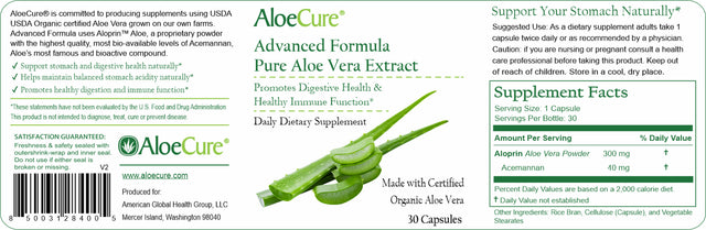 - GROWN BY ALOECURE: Experience the natural healing power of Aloe Vera with our Aloe Vera Capsules made from ECOCERT USDA Certified Organic Aloe Vera - specially formulated to naturally support digestive function and promote wellness. We grow and operate our own organic aloe vera farms and use only the inner leaf of Gel and a proprietary low temperature process to remove aloin ensuring quality at every step of the process and most nutritious aloe possible.