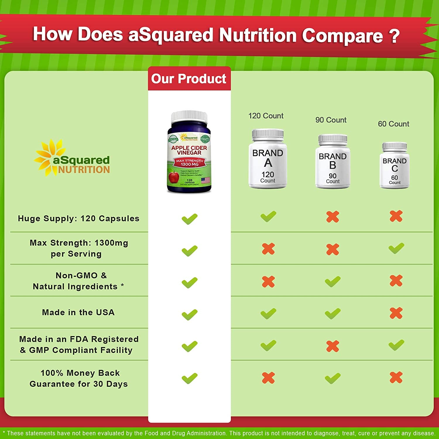 aSquared Nutrition's high quality formulation contains 1300 mg of Apple Cider Vinegar per serving, and 120 vegetable capsules in each bottle for a full 60 day supply (2 capsules per serving). *