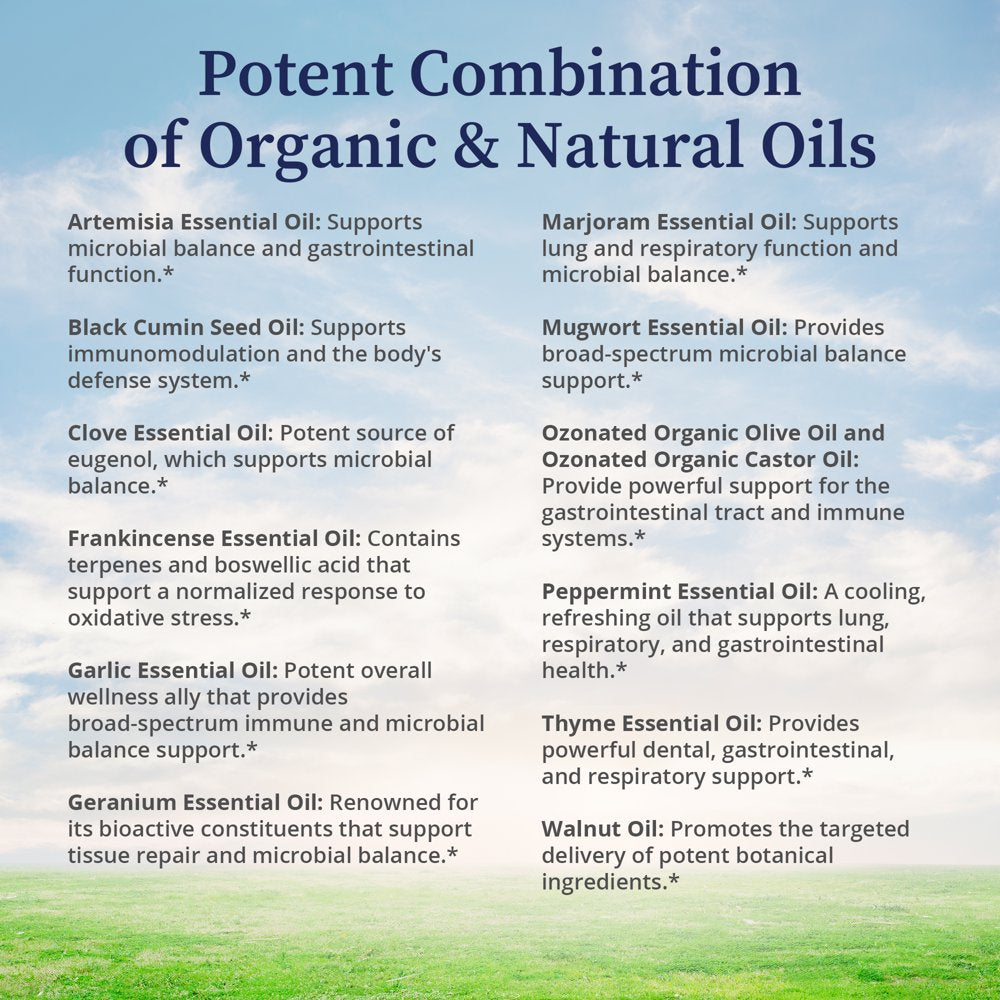 • POTENT COMBINATION OF OZONATED ORGANIC & NATURAL OILS: Contains Artemisia, Black Cumin Seed, Clove, Frankincense, Garlic, Geranium, Marjoram, Mugwort, Peppermint, & Thyme Essential Oils, as well as Walnut Oil and Organic Ozonated Olive & Castor Oil.