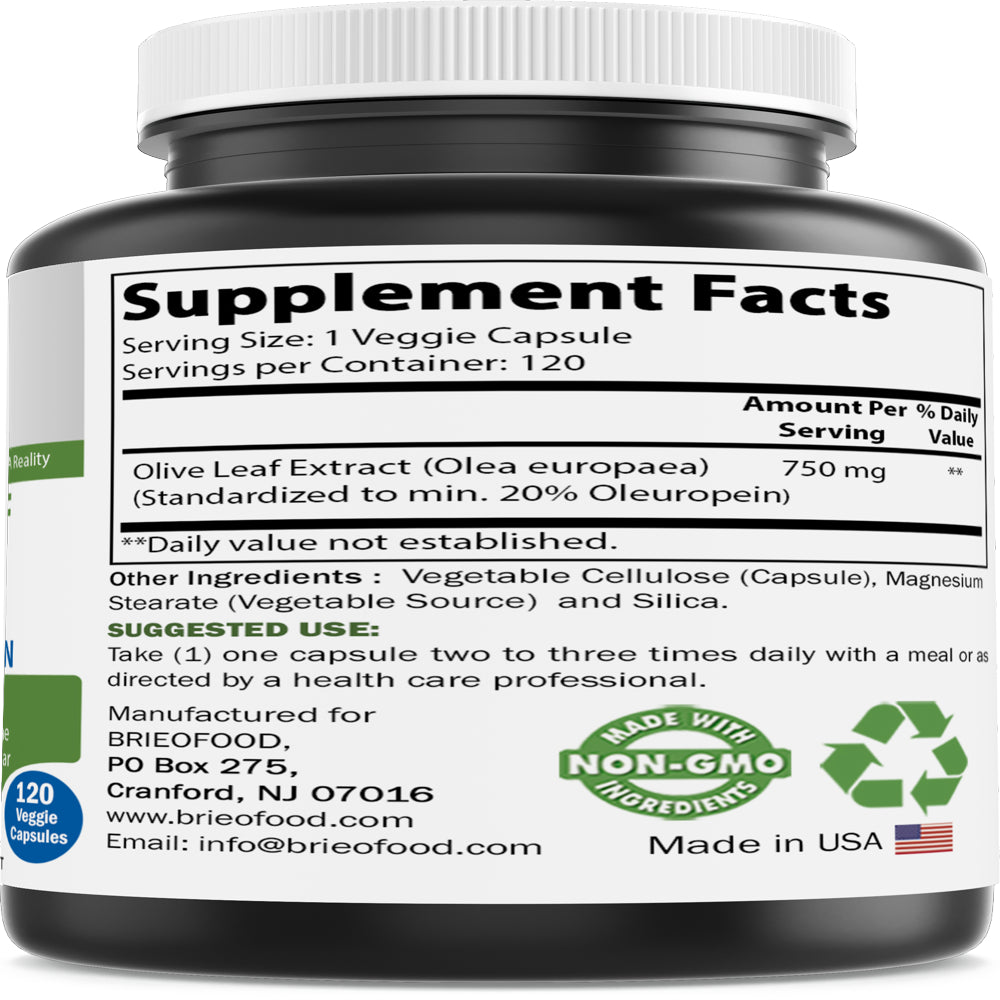 Brieofood Olive Leaf Extract 750 mg - 20% Oleuropein - Immune Support - 120 Veggie Capsules. Free of gluten, wheat, milk/dairy, nuts, soy, eggs, fish, shellfish, yeast, sugar, lactose, & artificial additive. All Brieofood products are manufactured in the USA in accordance with Good Manufacturing Practices (GMP), among the highest quality standards in the world.