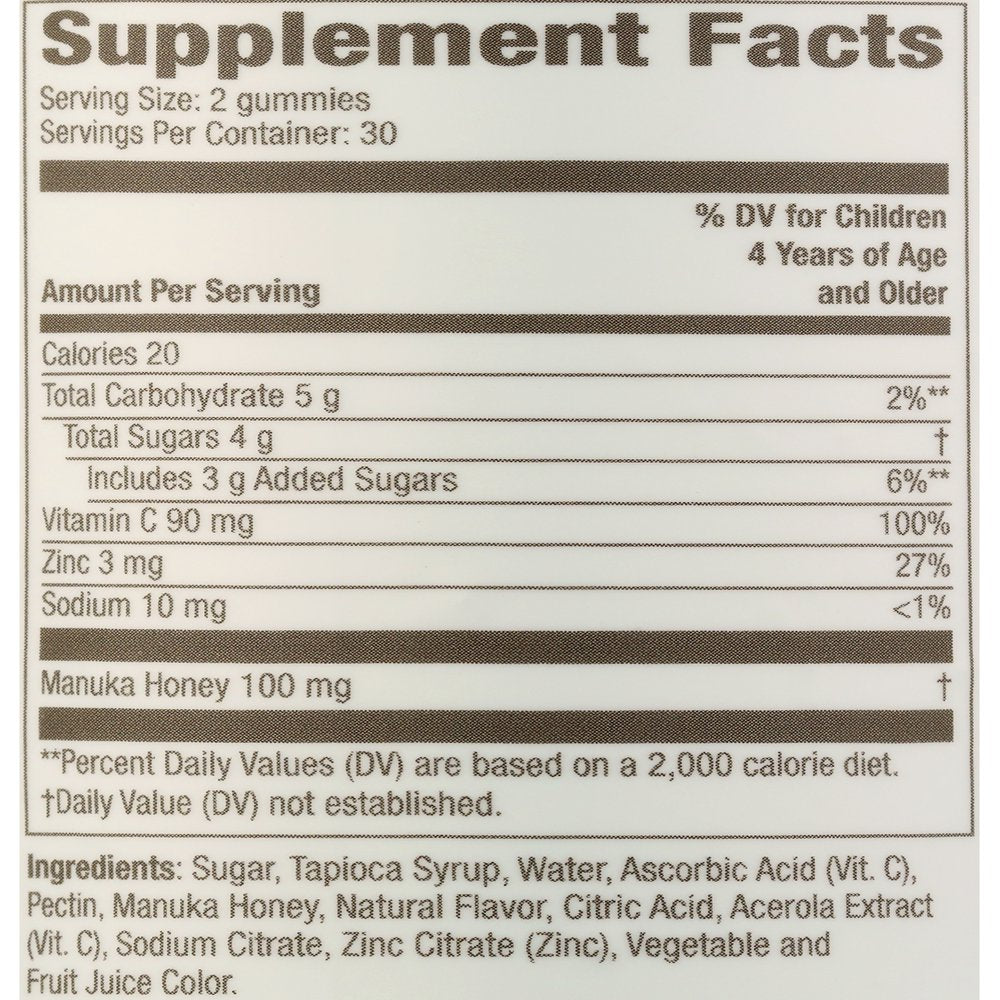 To raise happy, healthy kids, parents need safe and effective products they can trust. So, when your child needs extra support, you can feel good about giving them some of the best ingredients that nature has to offer. Burt's Bees Kids Immune Support Gummies are a dietary supplement that feature the essential nutrients Zinc and Vitamin C to help support a healthy immune system. Contains 100 Percent Natural Manuka Honey and Vitamin C from ascorbic acid and the Acerola cherry superfruit. Orange flavored with other natural flavors. Non-GMO (ingredients not genetically engineered). Excellent source of Vitamin C. For kids ages 4 years and older. Burt's Bees Kids Immune Support Gummies are gluten free. This statement has not been evaluated by the Food and Drug Administration. This product is not intended to diagnose, treat, cure, or prevent any disease.