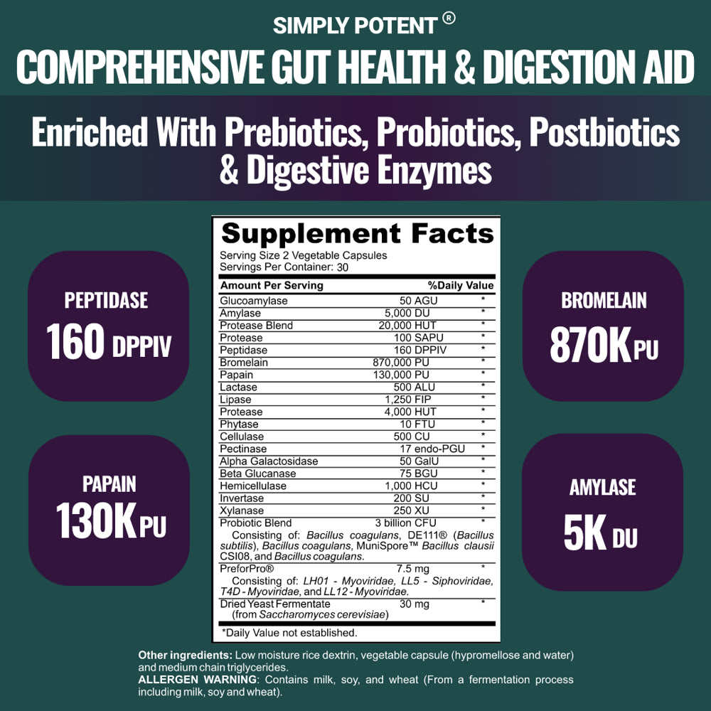 Introducing a safe and effective way to provide potent aid to your digestive health! Simply Potent Complete Gut Health combines the power of digestive enzymes, prebiotics, probiotics, and postbiotics to create an all-in-one gut health supplement that supports digestion, enzymatic action, balanced gut microbiomes, intestinal tract health, and immunity.