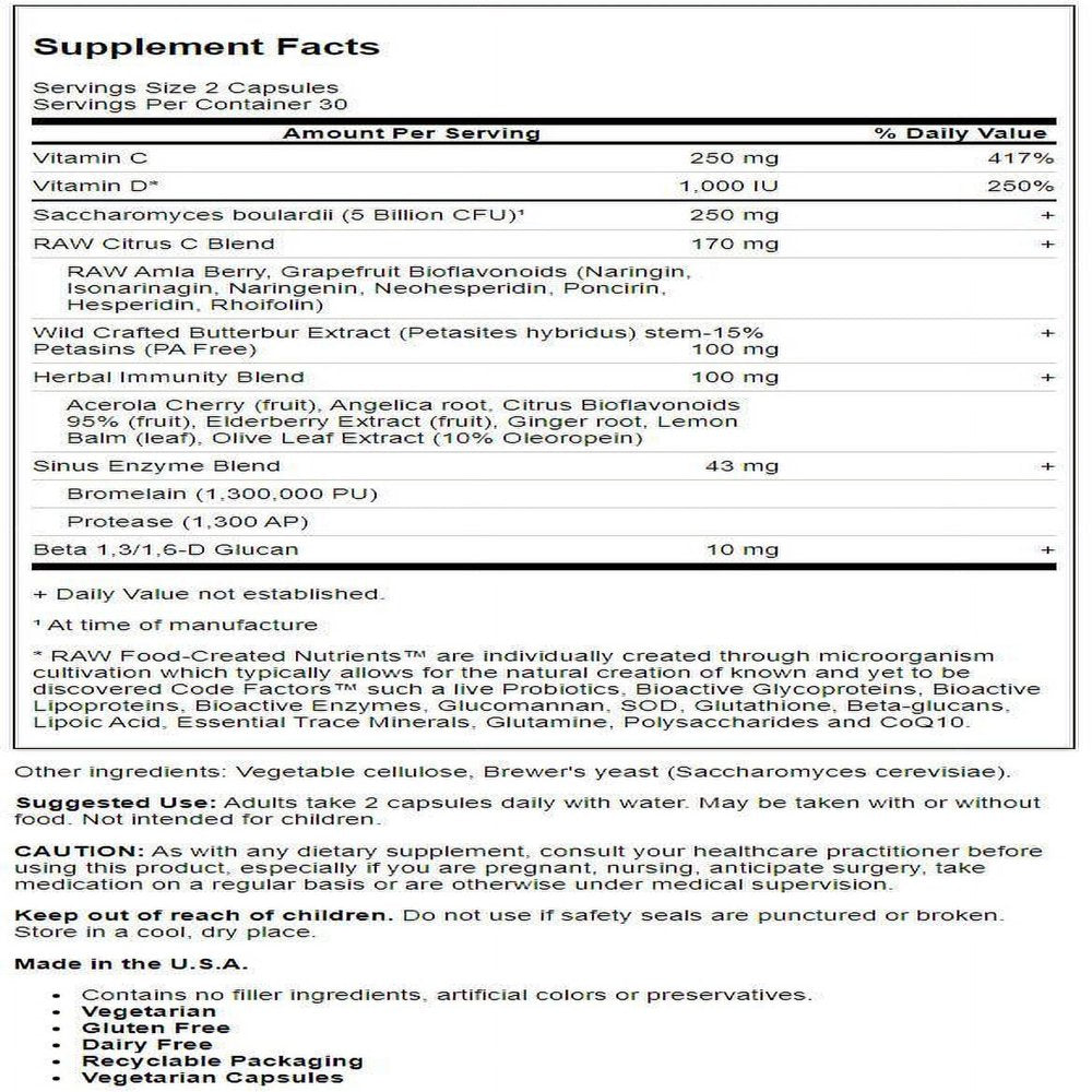 Garden of Life Immune Balance Sin provides you multidimensional immune support for your sin and upper respiratory system. It features raw food vitamins and minerals to feed your body what it needs and traditional herbs and botanicals to help support healthy immune function. Immune Balance Sin also delivers 100 mg of PA free butterbur extract for a further boost. Vegetarian, gluten free and dairy free.