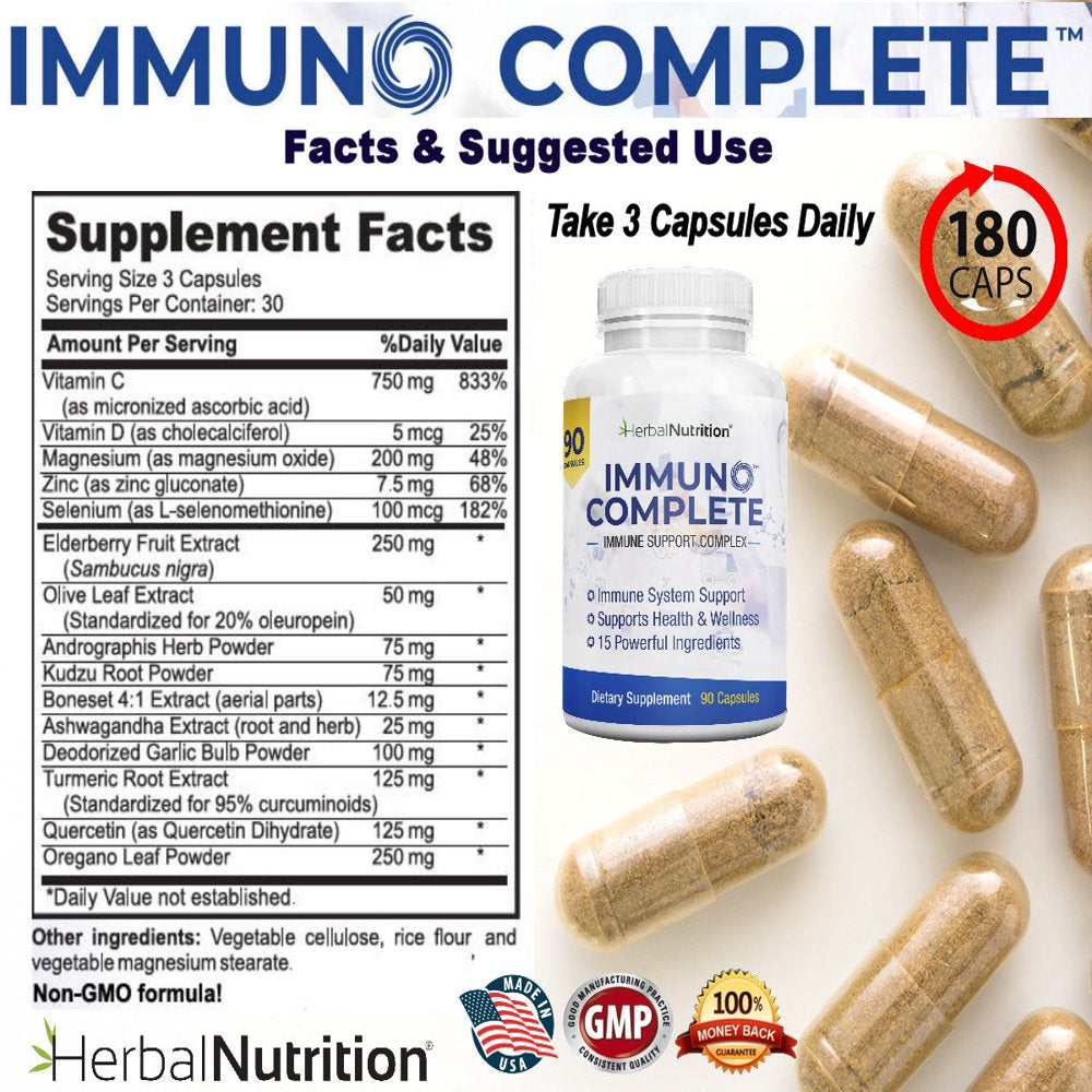 OUR SYNERGISTIC INGREDIENTS – Formulated to provide immune system support our capsules provide Vitamin C, Vitamin D, Zinc, Magnesium, Selenium, Elderberry, Garlic Bulb Powder, Kudzu Root, Turmeric Root, Olive Leaf Extract, Boneset, Ashwagandha Extract, Andrographis and Quercetin. Stack our Immuno Complete capsules with our D3 /K2 Liquid drops for a new daily routine for immune health. MADE IN THE USA AND OF THE HIGHEST QUALITY and we guarantee it!