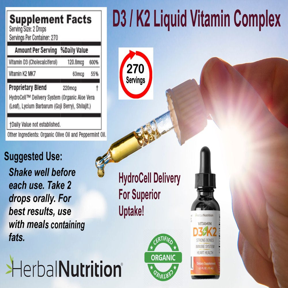 D3 / K2 LIQUID VITAMIN COMPLEX - Lets the sunshine through and provides 120.8mcg (5000iu) of D3 and 63mcg of vitamin K2 (MK7), the optimum combination of these ingredients. Plus, our formula uses a Hydrocell Delivery System for superior absorption. Supports immune health, strong bones, and heart healthy.