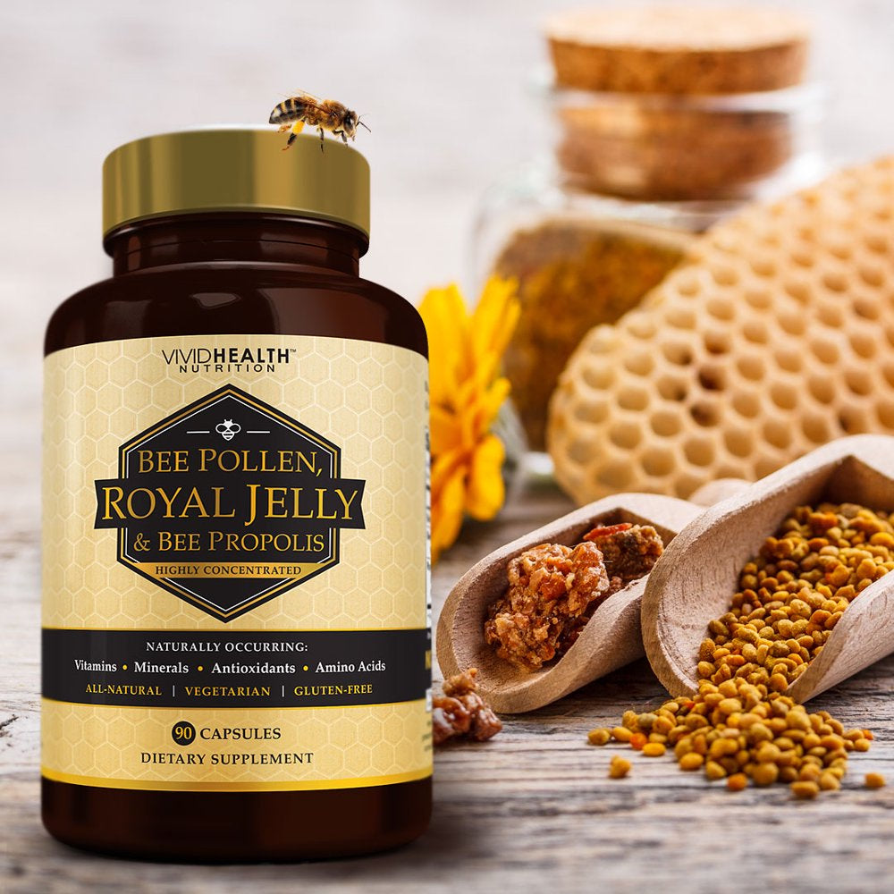 Vivid Health Nutrition Royal Jelly & Bee Pollen with Bee Propolis is a concentrated, all-natural formula of Royal Jelly, Bee Pollen and Bee Propolis, a mixture of highly potent bee products with health and healing properties that have been used for centuries. Bee Pollen has been known for centuries as a "super food." The pollen collected by bees, mixed with enzymes from the bees themselves, contains at least 18 amino acids which are the building blocks of protein needed for every cell in the body, from blood cell to the skin, organs and bones. It also contains important enzymes that support immune system health. Not only great for your overall health, bee pollen also naturally acts as an appetite suppressant. Additionally, Bee pollen naturally contains lecithin, shown to help reduce body fat. Vivid Health Nutrition's High Potency Royal Jelly and Bee Pollen with Bee Propolis sets the standard with its highly concentrated formula, utilizing only the finest quality ingredients to create a powerful superfood combination that provides a nearly endless list of health benefits. Many customers look for natural aids such as Propolis Capsules, Bee Pollen Capsules or Royal Jelly Capsules, but this premium blend contains all three of Nature's superfood vitamins and minerals.