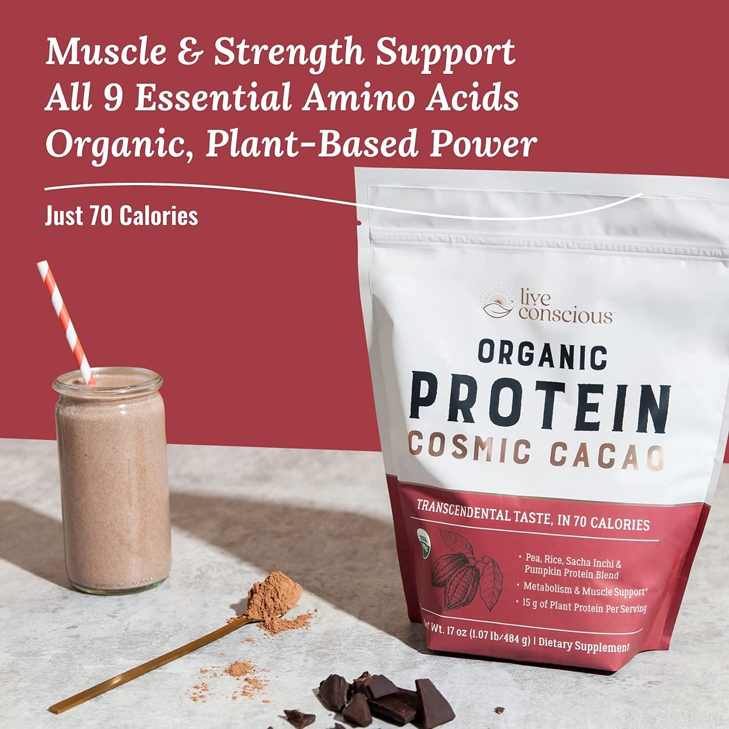 - Organic, Vegan, and Under 80 Calories: Certified Organic, Live Conscious Proteins are vegan and only 80 calories. Perfect to supplement a healthy diet or as a delicious post-exercise shake.*