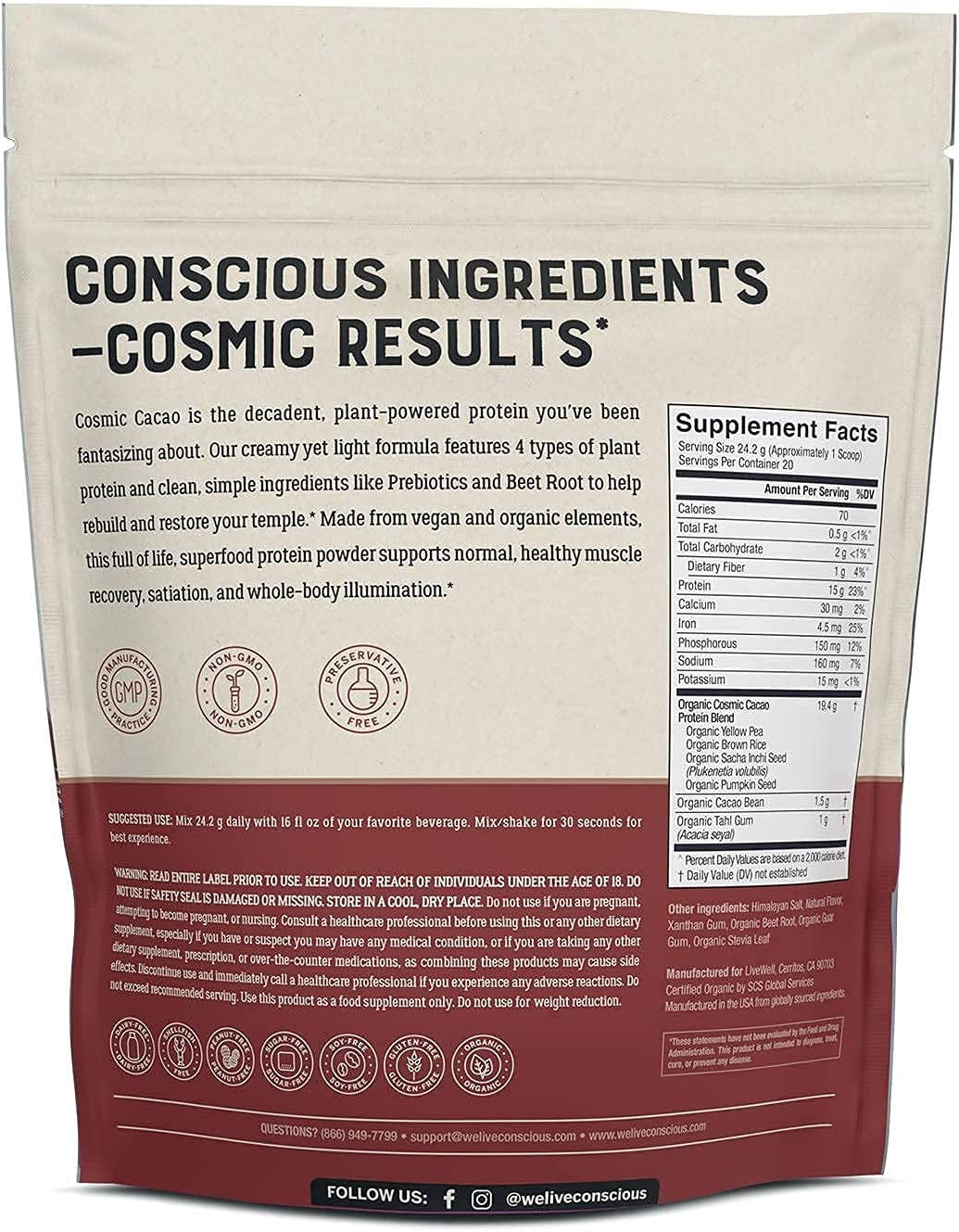 Live Conscious beyond Greens Concentrated Superfood Powder & Organic Pea Protein Powder - Cosmic Cacao Chocolate Flavor | Immune System Boost & Gut Health + Metabolism & Muscle Support