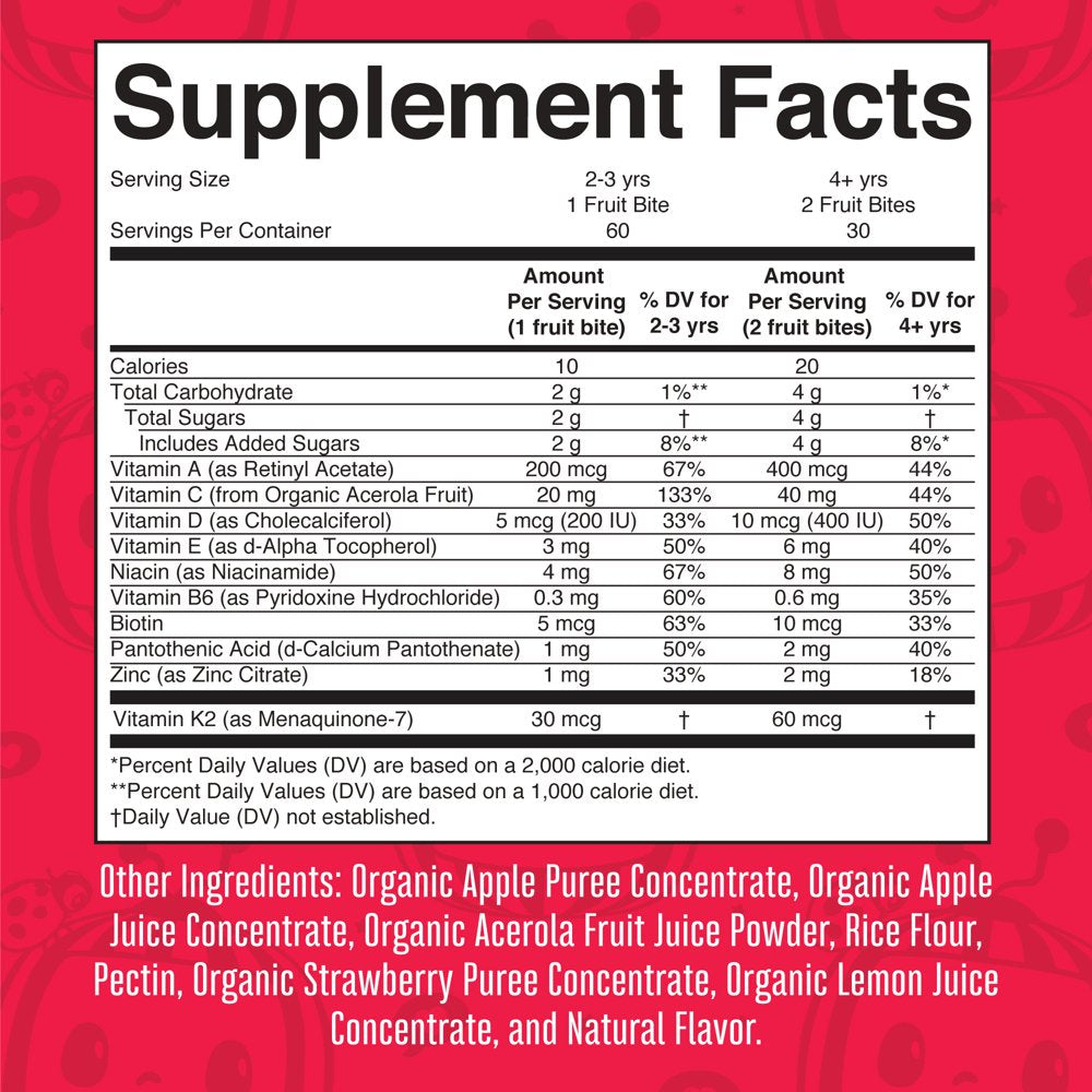 Packed with ten vitamins and minerals for broad-spectrum support, these fruit bites contain ten vitamins and minerals to help to fill potential nutrient gaps to support your toddler’s overall wellness, growth, and development. Your child will love the fun Cocomelon characters featured on the bottle, as well as the delicious juicy strawberry-flavored bites! Made from real fruit purees, concentrates, and juices, these fruit bites use a new and innovative type of nutrient delivery method. Each fruit bite is packed with ten vitamins and minerals, including vitamins C, D, and E, as well as some B vitamins, zinc, and vitamin K2. These vegan bites contain no artificial colors or flavors, never made with gelatin, are gluten-free, pectin based, and are free from all top nine allergens. They are coated in rice flour to prevent sticking.