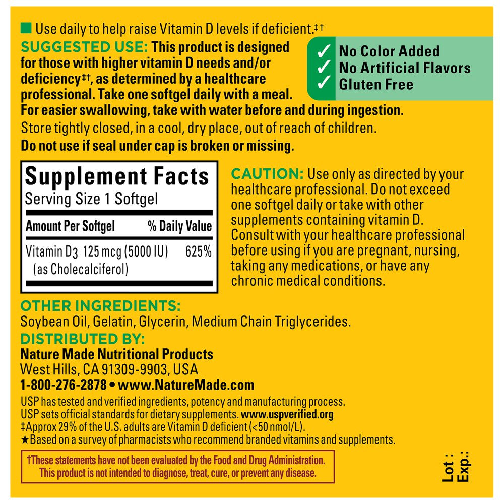 Nature Made Extra Strength Vitamin D3 5000 IU Softgels (125 mcg) offer an easy way to add Vitamin D supplements to your daily routine to support bone, teeth, muscle, and immune health. Sourced from high quality ingredients, these Nature Made Vitamin D softgels are gluten free dietary supplements with no color added and no artificial flavors. Each Vitamin D3 5000IU (125 mcg) softgel supports a healthy immune response and aids in calcium absorption. Vitamin D is a common nutrient shortfall. D3 vitamin is the body’s preferred form of Vitamin D to help maintain Vit D levels. These extra strength Nature Made Vitamin D3 supplements are are for those with higher Vitamin D needs and/or deficiency, as determined by a healthcare professional (1). Adults, take one D3 Vitamin 5000 IU softgel daily with water and a meal. This Nature Made Vitamin D supplement is quality you can trust. USP has tested and verified ingredients, potency and manufacturing process. USP sets official standards for dietary supplements. Visit the USP verified website for more information. (1)Approximately 29% of the U.S. adults are Vitamin D deficient (<50 nmol/L) *Based on a survey of pharmacists who recommend branded vitamins and supplements.CAUTION: Use only as directed by your healthcare professional. Do not exceed one softgel daily or take with other supplements containing vitamin D, such as multivitamins with vitamin D. Do not take if you are pregnant, nursing or have kidney disease, hypercalcemia (high blood calcium), or may have sensitivity to hypercalcemia (such as cancer, hyperparathyroidism, sarcoidosis or other granulomatous disorders) unless recommended by a healthcare professional.