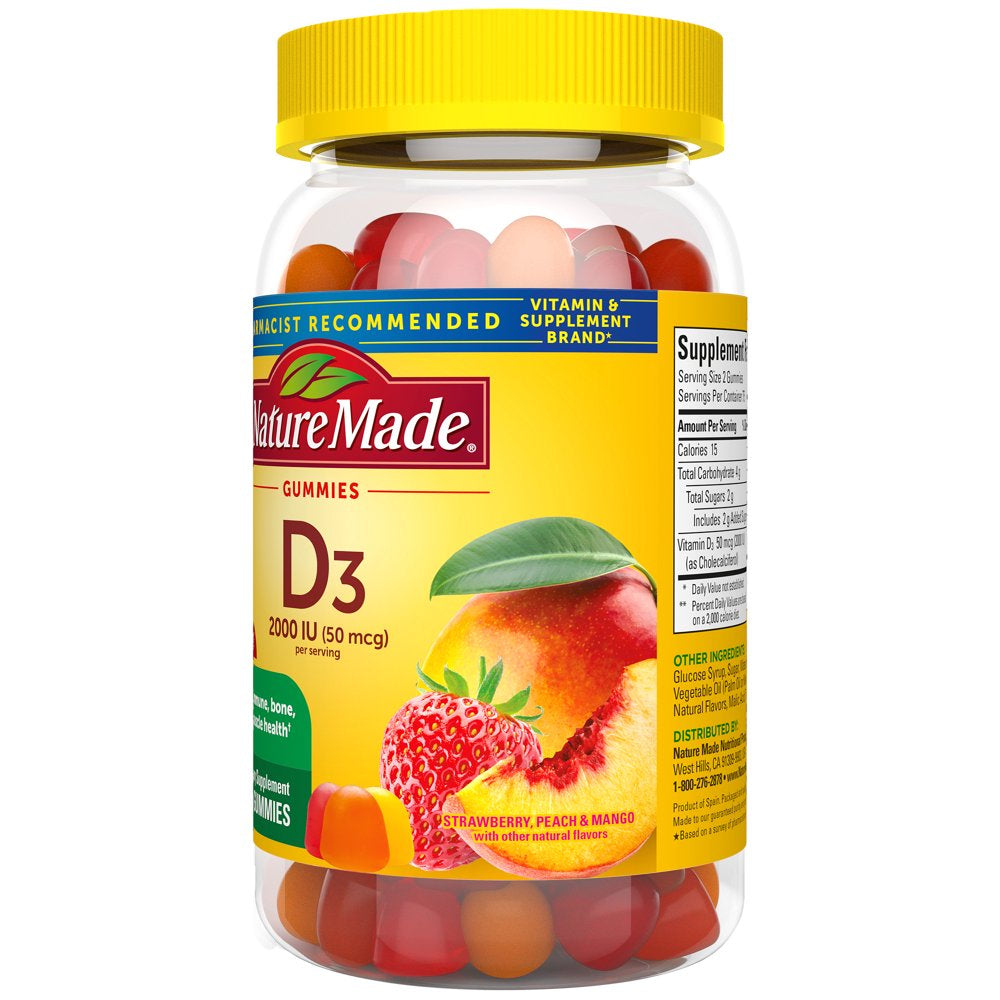 Nature Made Vitamin D3 2000 IU Gummies (50 mcg) per serving offer an easy way to add Vitamin D supplements to your daily routine to support bone, teeth and muscle health. Sourced from high quality ingredients, these Nature Made Vitamin D3 gummies for adults are gluten free dietary supplements with no synthetic dyes, no high fructose corn syrup, and no artificial sweeteners. Each Vitamin D3 2000IU gummy supports a healthy immune response and aids in calcium absorption. Vitamin D is a common nutrient shortfall. D3 vitamin is the body’s preferred form of Vitamin D to help maintain Vit D levels. Featured in delicious strawberry, peach and mango with other natural flavors, these Nature Made Vitamin D3 supplements contain 50mcg (2000 IU) of Vit D3 per serving. Adults, chew two Vitamin D3 Nature Made gummies daily. This Nature Made Vitamin D supplement is quality you can trust. *Based on a survey of pharmacists who recommend branded vitamins and supplements.CAUTION: If you are taking medication, consult your physician before use.