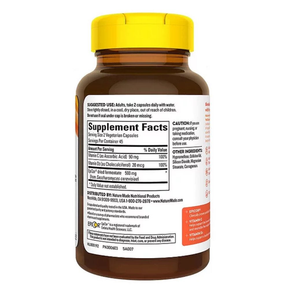 This Nature Well blends Made Vitamin C supplement also provides Vitamin C and Vitamin D3. Vitamin C functions as an antioxidant to help support the immune system by neutralizing free radicals in the body. Vitamin D3 is the body’s preferred form of Vitamin D and helps support a healthy immune response. Each serving (2 vegetarian capsules) contains Epicor 500mg, Vitamin C 90 mg, and Vitamin D3 800 IU (20 mcg). Get immune support and more with Nature Made Well blends Immune & Respiratory. This is the perfect supplement to boost your immune support and get back to a healthy, rejuvenating life!