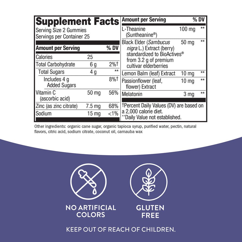 - Also formulated with elderberry extract, L-theanine, lemon balm extract, and passionflower extract.