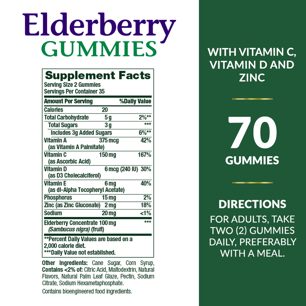 • IMMUNE SUPPORT: 70-count, 100mg Elderberry Gummies for immune support.* Elderberries have a long history of use, especially as a food. Nature’s Bounty Elderberry Gummies contain 100mg of this naturally occurring flavonoid.