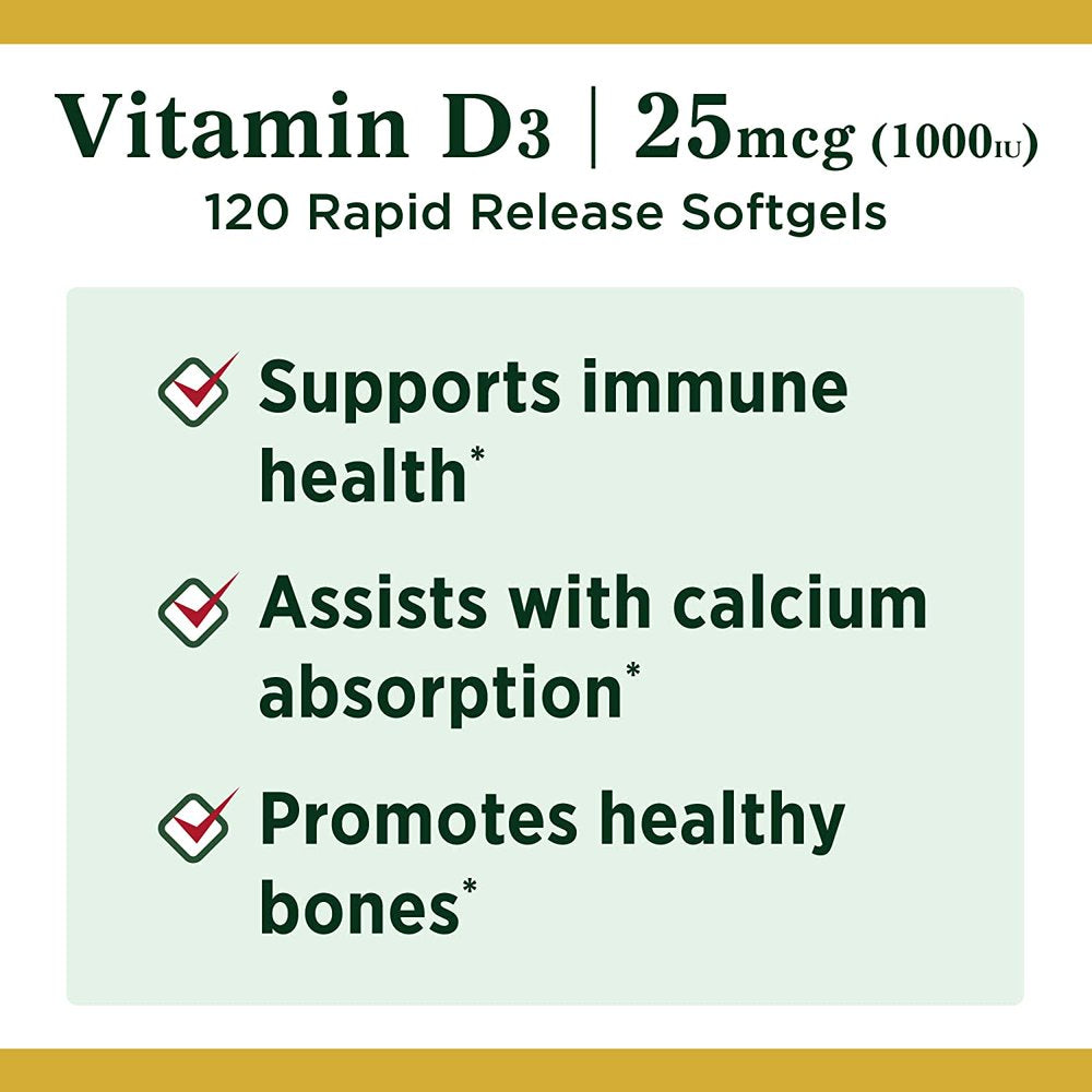 - Nature's Bounty Vitamin D3 1000 IU Softgels for Bone & Immune Support, 120 Ct