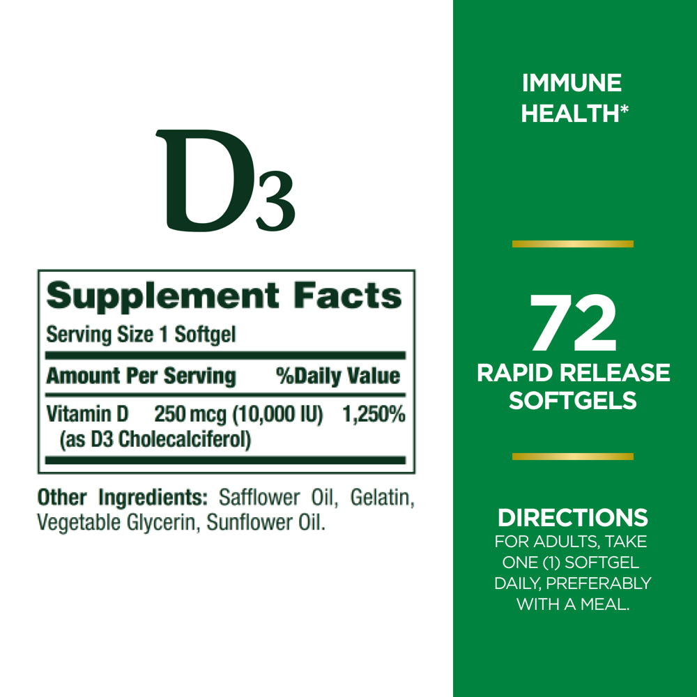 • Nature's Bounty Vitamin D3, Immune Health, 250 mcg, Softgels, 72 Ct