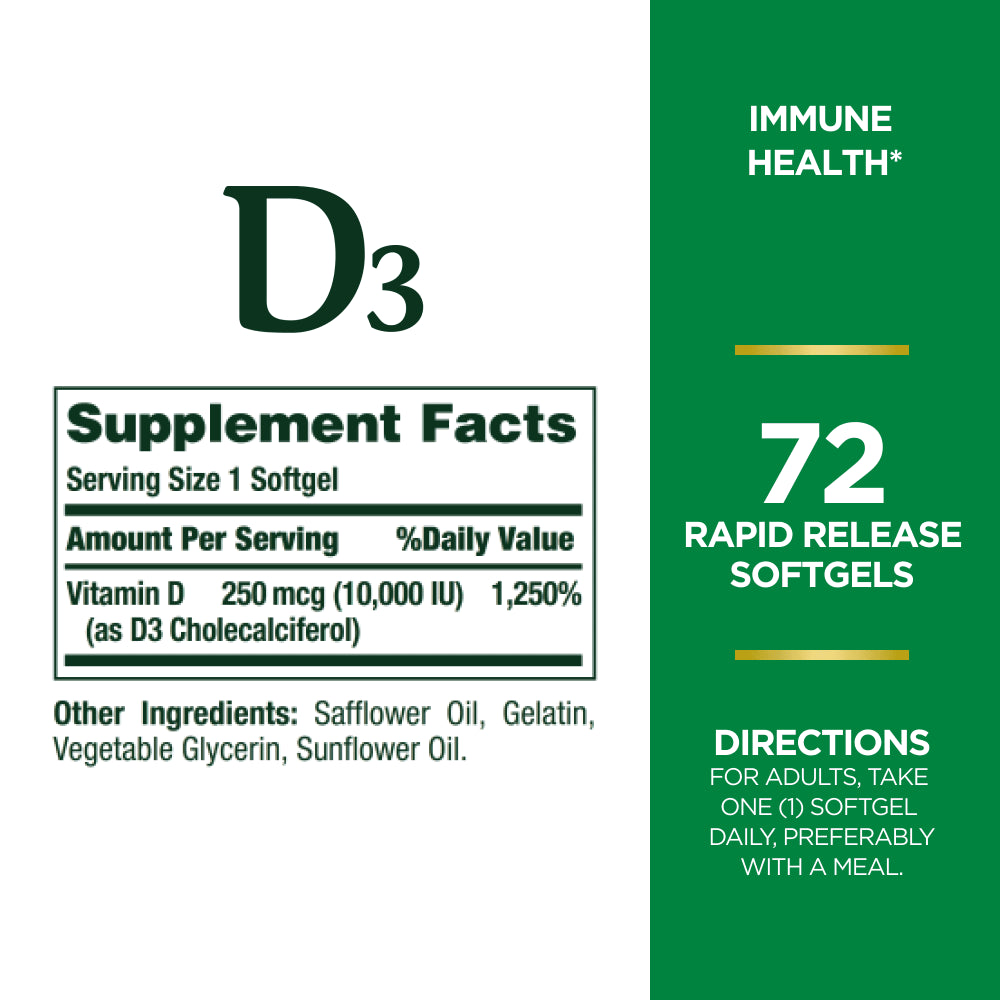 • IMMUNE SUPPORT: 72-count, 10000IU Vitamin D3 Softgels for immune health.* Vitamin D by Nature’s Bounty may assist the immune system by helping to regulate T and B-lymphocytes.* Vitamin D3 is a more potent form of Vitamin D.