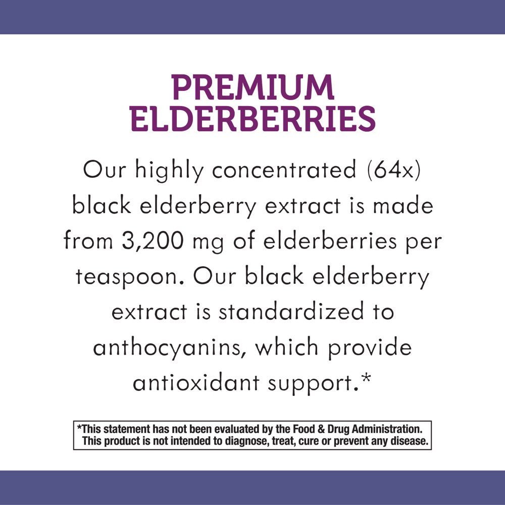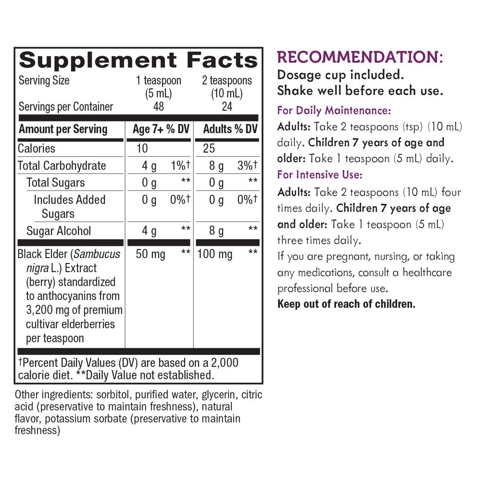 - Made from 6,400 mg of elderberries per 2-tsp serving.