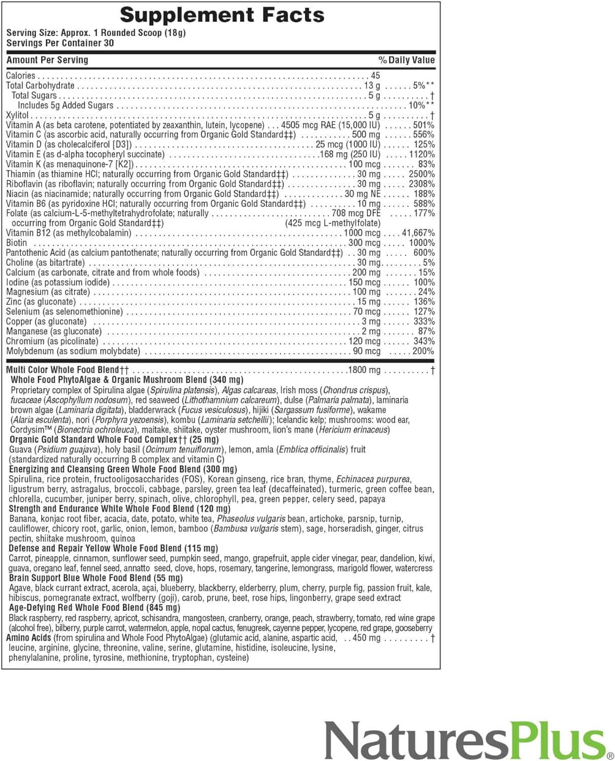 | Key Ingredients | Multivitamin & Multimineral Complex, Whole Food Blends (PhytoAlgae & Mushroom, Omega Fatty Acid & Prebiotic Blend, Multi Color, Age-Defying, Strength & Endurance, Energizing & Cleansing, Defense and Repair, Brain Support), Animo Acids, Enzyme Blend | Multivitamin & Multimineral Complex, Whole Food Blends (PhytoAlgae & Mushroom, Multi Color, Anti-Aging, Strength & Endurance, Energizing & Cleansing, Defense and Repair, Brain Support), Animo Acids, Enzyme Blend, Omega Fatty Acid & Prebiotic Blend | Multivitamin & Multimineral Complex, Whole Food Blends (PhytoAlgae & Mushroom, Multi Color, Age-Defying, Strength and Endurance, Energizing and Cleansing, Defense and Repair, Brain Support, Bioflavonoid and Antioxidant), Animo Acids | Vitamins A, B6, B12, C, D3, E, K2, Thiamin, Riboflavin, Niacin, Biotin, Folate, Pantothenic Acid, Choline, Calcium, Iodine, Magnesium, Zinc, Copper |