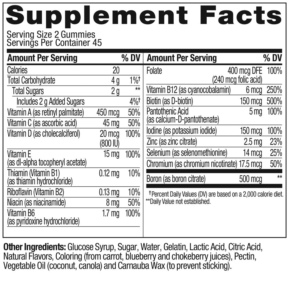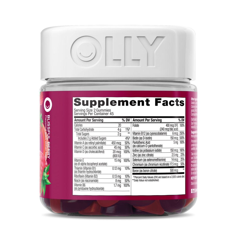 OLLY Women’s Multi gummies are delicious, scientifically formulated, gluten free gummy vitamins. Our Blissful Berry gummy vitamins for women are packed with key nutrients to nourish you daily so you can keep doing your thing. This female multivitamin blend features B Vitamins to support cellular energy production, Vitamin D to support bone health, plus Vitamins A, C & E. The chewable daily vitamins are a powerful blend for overall wellness and to help fill the gaps when your eating habits are a little less than perfect.*Good health is at the center of everything we do. That's why we’ve made it our mission to make nutrition easy to understand. We do it by crafting products that are as effective as they are delicious—because we know when something feels good, you’re more likely to do it.**These statements have not been evaluated by the Food and Drug Administration. This product is not intended to diagnose, treat, cure or prevent any disease.