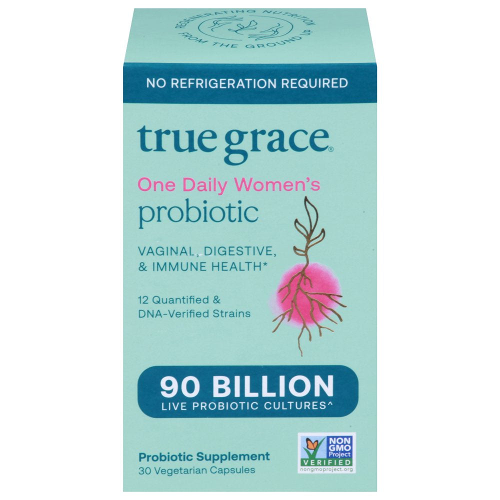 - Probiotic Supplement. Soy free. Gluten free. Dairy free Non-GMO Project verified. nongmoproject.org. No refrigeration required. One daily women's probiotic. Vaginal, digestive, & immune health. 12 quantified & DNA-verified strains. 90 billion live probiotic cultures (Total bacterial concentration at time of manufacturing). True difference. Our Probiotics: A truly-transparent probiotic label showing the precise percentage of each DNA-verified strain in 90 billion total CFU (Total bacterial concentration at time of manufacturing). Our Capsules: True Grace probiotics are delivered in patented vegetarian Drcaps to provide protection from stomach acid, allowing the probiotics to survive digestion and reach the intestinal tract. Our Bottle: True Grace probiotics are packaged in a patented shelf-stable CSP bottle which protects the probiotic cultures from moisture, light, and oxygen, extending shelf life and ensuring the stability of the product. Purity-iQ: Certified authentic purity-iq.com. truegracehealth.com. For questions or comments email:care(at)truegracehealth.com. Proud supporter of Regenerative Agriculture. FSC.:Mix Packaging from responsible source. www.fsc.org. We're regenerating nutrition from the ground up through nutrient-dense supplements that improve the health of body and planet. Learn more about our formulation philosophy, sustainability efforts, and commitment to Regenerative Agriculture at truegracehealth.com. Please recycle this paper box. Regenerating nutrition from the ground up. (This statements has not been evaluated by the Food and Drug Administration. This product is not intended to diagnose, treat, cure, or prevent any disease.) Made in Canada.