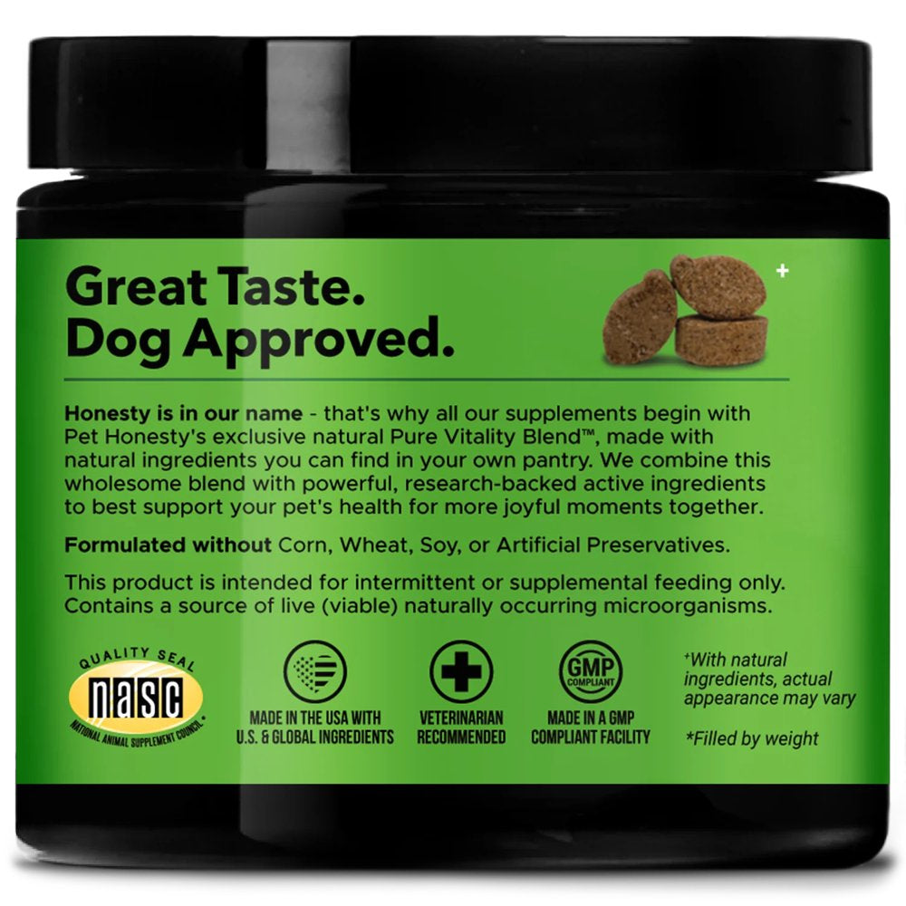 Pet Honesty’s Probiotics Gut + Immune Health is vet-recommended to promote a strong immune system, support healthy digestion, & help maintain proper gut flora. These chews are formulated with our Pure Vitality BlendTM, made with natural ingredients you can find in your own pantry. We combine this nutritious blend with powerful, research-backed active ingredients to best support your dog where they need it most. This effective formula contains powerful ingredients like probiotics, chicory root, & digestive enzymes to support beneficial bacteria in the gut & address imbalances that can contribute to digestive upsets for your dog.