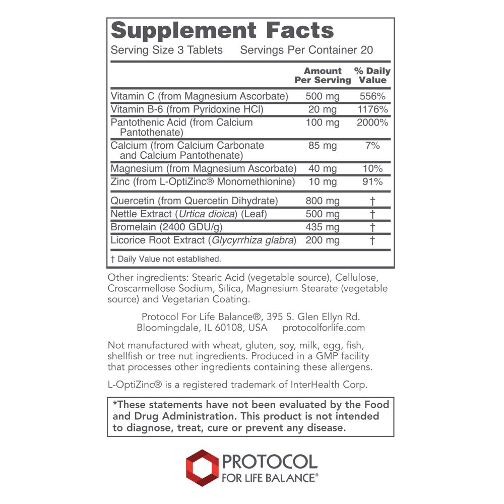 Aller-All is a well-balanced blend of vitamins, minerals, and botanicals. These nutrients are known for their ability to support the body's balanced response to environmental and seasonal changes.* It combines quercetin, bromelain, and vitamin C to support healthy respiratory structures and functions.* This combination is known to support the body's normal response to typical seasonal challenges.* Other ingredients, such as B vitamins, zinc, magnesium, and licorice root, are included to further support both the respiratory and immune systems.* L-OptiZinc is a registered trademark of InterHealth Corp. At Protocol for Life Balance, our mission is to provide high-quality, affordable solutions that empower people to lead healthy and happy lives. Our extensive line of premium natural health products uses well-researched ingredients that meet the highest quality standards. Every Protocol for Life Balance product must pass a rigorous internal review to ensure relevance, efficacy, and quality.