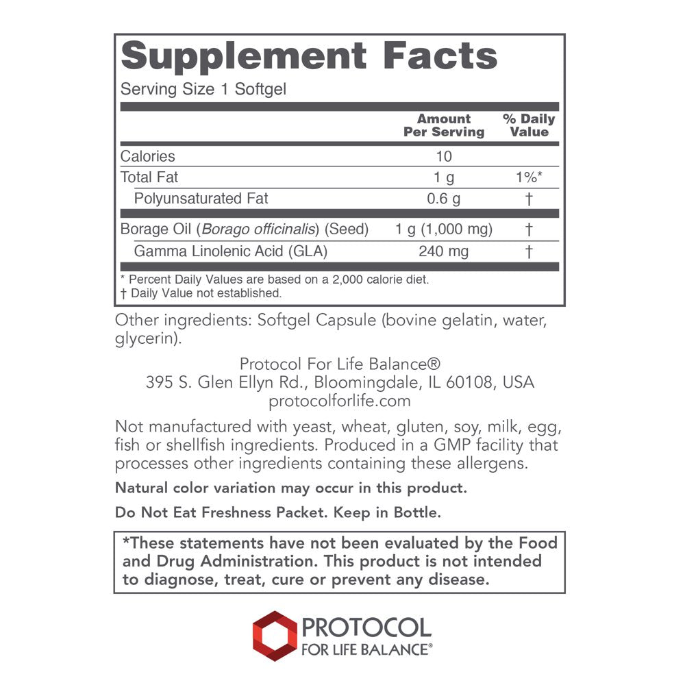 Protocol for Life Balance - Borage / GLA 1,000 Mg - Rich in Omega-6 Fatty Acids - Helps Reduce Inflammation, Supports Healthy Immune System, Joint Function, Hormonal Imbalances - 60 Softgels
