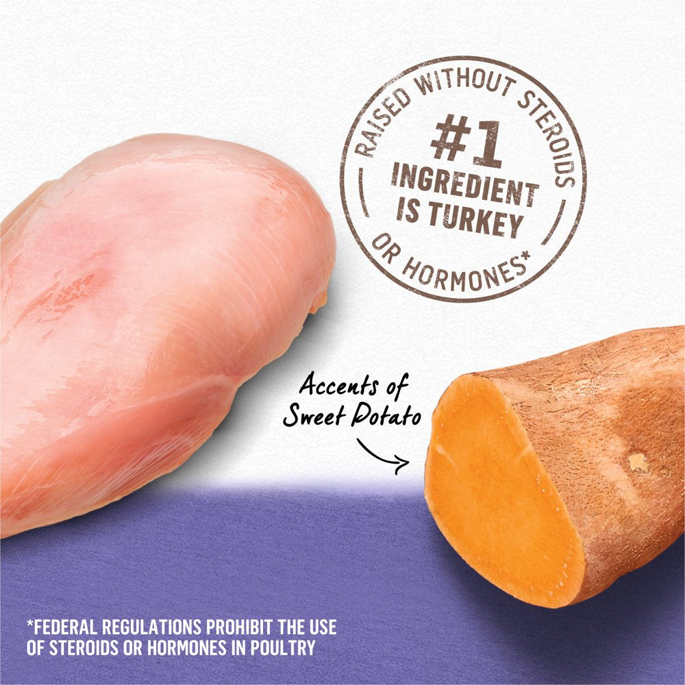 - Real turkey raised without steroids or hormones is the #1 ingredient in our Grain-Free dog food with sweet potato (Federal regulations prohibit the use of steroids or hormones in poultry)