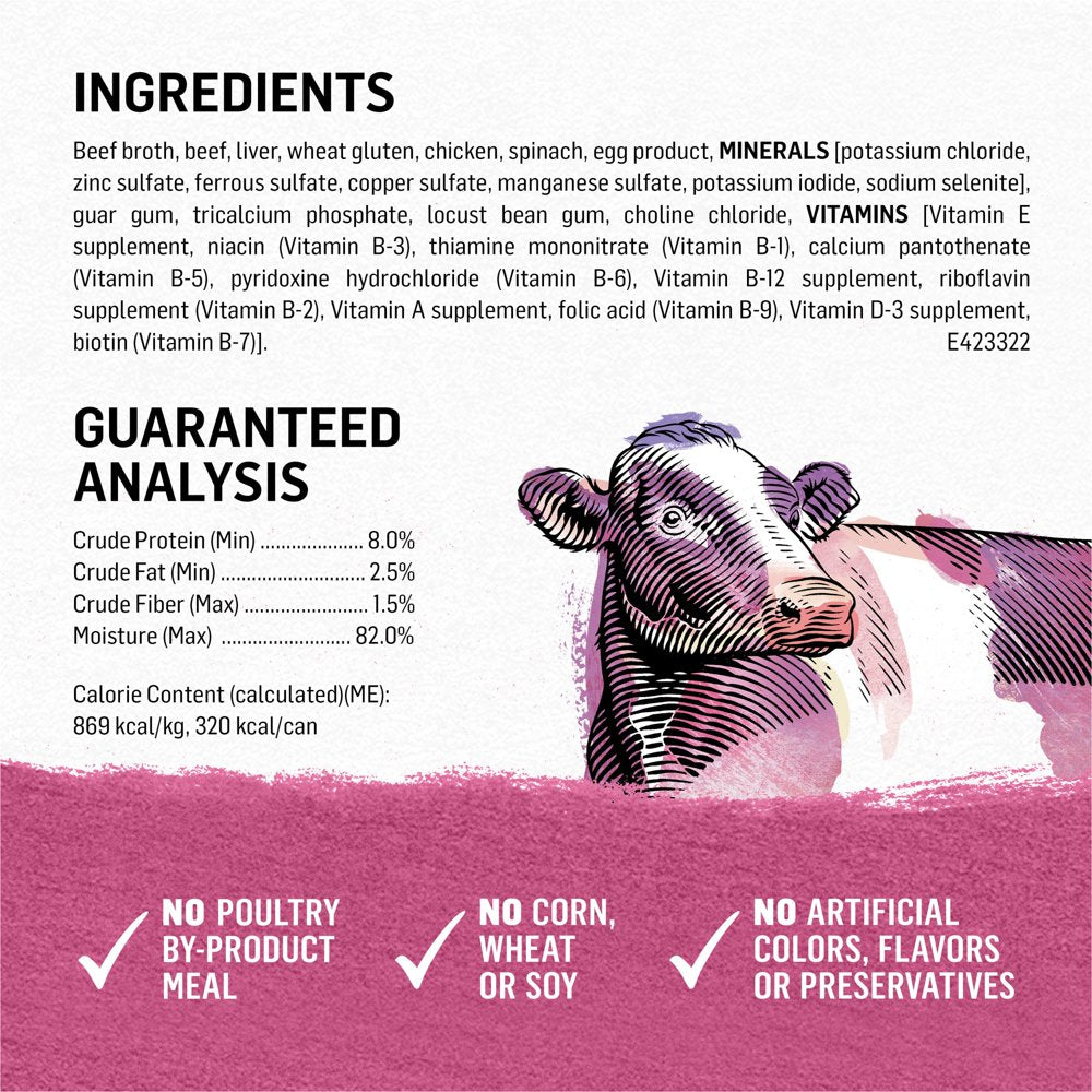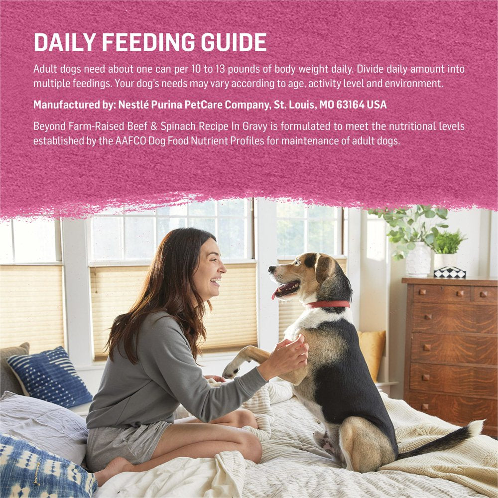 Purina Beyond Supprot Immune Health Wet Dog Food Beef Spinach, Treat your dog to purposeful nutrition with Purina Beyond Texas Beef and Spinach Recipe natural dog food with gravy. Made with real Texas beef and accents of spinach, natural prebiotic fiber and other high-quality ingredients, this high-quality wholesome dog food helps support your dogs daily adventures. Offer your adult dog a simply made, wholesome high protein canned dog food with no poultry by-product meal, artificial colors, flavors or preservatives. Enjoy giving your dog Purina high protein dog food gravy with natural prebiotic fiber that meets your high standards.