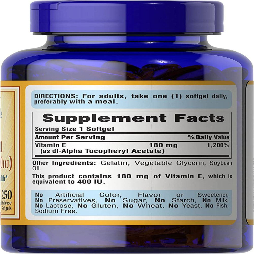Contains antioxidant properties that help fight free radicals in the body* How does Vitamin E help keep you healthy? It is a potent antioxidant that helps fight free radicals in your body.* Free radicals can cause oxidative stress which may damage cells. Free radicals are unstable and reactive compounds with unshared electrons. They can be produced naturally or as a result of external factors like air pollutants and smoking. Free radicals cause a disruptive chain reaction that may ultimately disturb the normal operations of a cell. The job of an antioxidant is to intercept free radicals. Thanks to its unique chemical structure, Vitamin E provides beneficial antioxidant support.* It also supports immune function.* Directions: For adults, take one (1) softgel daily, preferably with a meal. Other Ingredients: Gelatin, Vegetable Glycerin, Soybean Oil. WARNING: If you are pregnant, nursing, taking any medications, planning any medical or surgical procedure or have any medical condition, consult your doctor before use. Discontinue use and consult your doctor if any adverse reactions occur. Keep out of reach of children. Store at room temperature. Do not use if seal under cap is broken or missing. No Artificial Color, Flavor or Sweetener, No Preservatives, No Sugar, No Starch, No Milk, No Lactose, No Gluten, No Wheat, No Yeast, No Fish. Sodium Free.