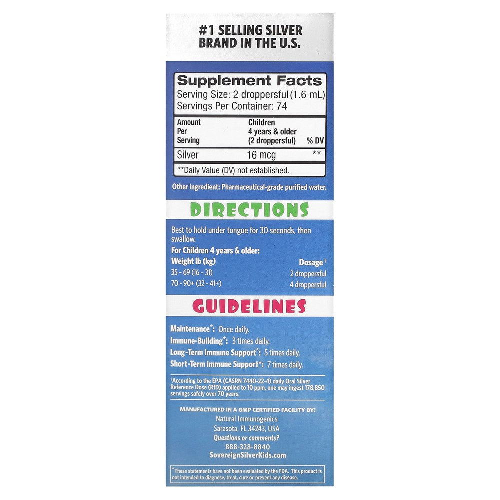 Since 1999 #1 Selling Silver Brand in the U.S Dropper-Top Dietary Supplement Non GMO Certified by NSF Vegan Gluten Free Allergen Free Why Silver for Kids Immune Support? We know it's difficult to get kids to take supplements. Wouldn't it be nice to have an immune product that tastes like water? Many children often refer to Sovereign Silver Kids as magic water! We've created a great tasting immune supplement for a child's healthy development: Quick' n Easy to Take No Smell No Taste No Complaints Sovereign Silver Kids will make your child happy while giving you the peace of mind knowing your child is getting the best immune support. Did you know? Silver has been used for more than 2,400 years to help safeguard human health. It is a natural element that can be found in whole grains, edible and medicinal mushrooms, mammalian milk, spring water, sea water and tap water. "Our technology makes the smallest particles ever seen with almost perfect dispersion...and an absolutely safe concentration that outperforms much higher ppm products." - Stephen L.Quinto, Founder Why Bio-Active Silver Hydrosol? Safe Tiny particle size yields greater surface area and higher efficacy. Our 10 ppm is more effective than competing brands containing up to 500 ppm. Even if taken 7 times a day for 70 years (based upon body weight), Sovereign Silver still falls below the EPA's daily Oral Silver Reference Dose (RfD). Pure Sovereign Silver has only two ingredients: 99.999% pure silver Pharmaceutical-grade purified water We have no added salts or proteins that render other silver products less effective. Our product is packaged in non-leaching glass bottles, never plastic. Effective If silver is not positively charged, it is not bio-active. Sovereign Silver contains greater than 98% bio-active silver, making it exponentially more powerful than other brands that only contain as little as 10% positively charged silver. Sovereign Silver also features an unprecedented particle size as small as 0.8 nanometers, which allows the body to easily absorb and eliminate.