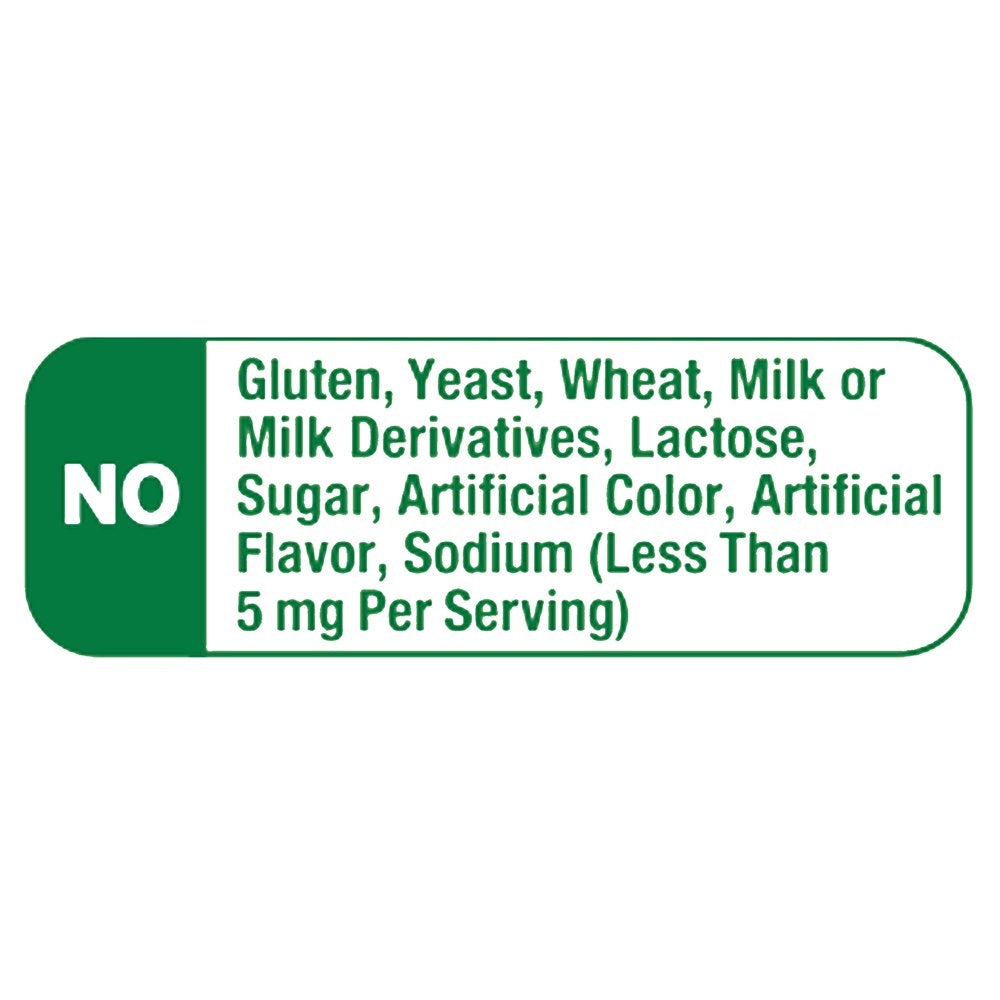 - No gluten, yeast, wheat, milk or milk derivatives, lactose, sugar, artificial color, artificial flavor, or sodium (less than 5 mg per serving)
