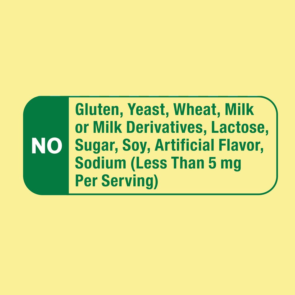 - No gluten, yeast, wheat, milk or milk derivatives, lactose, sugar, artificial color, artificial flavor, or sodium (less than 5 mg per serving)