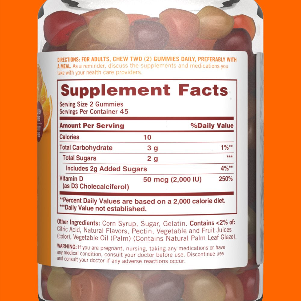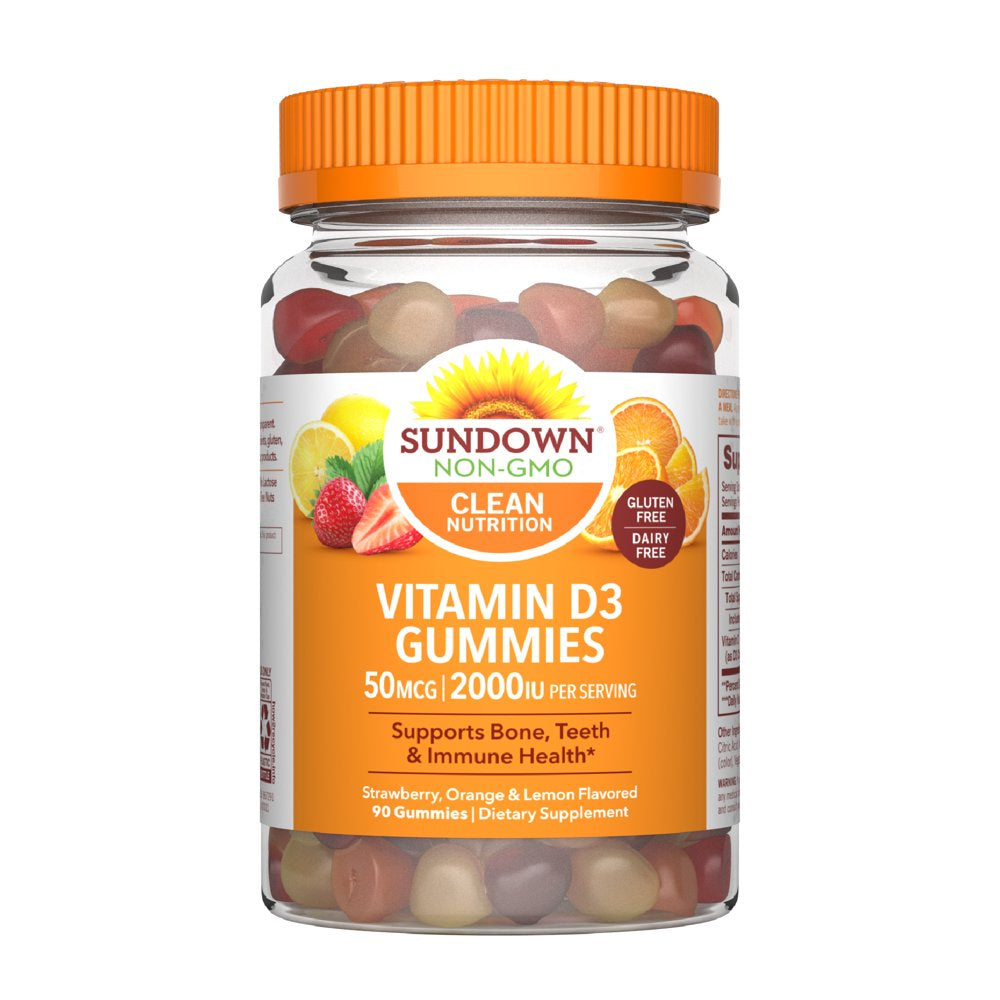 Sundown Vitamin D3 Gummies are an easy and delicious way to support your immune health. (2) Each serving contains 50 mcg (2000 IU) of Vitamin D3, a form of Vitamin D. Normally, the body produces Vitamin D through exposure to sunlight. If you don’t get enough sun each day, taking Sundown Vitamin D3 Gummies can help you get more of this essential nutrient. (2) Vitamin D helps your body absorb Calcium to support strong bones and teeth. (2) Sundown Vitamin D3 Gummies also support neuromuscular health and help maintain a healthy immune system. (2) For adults, chew two (2) gummies daily, preferably with a meal. You’ll enjoy the tasty strawberry, orange, and lemon flavors. At Sundown, we believe in living clean (1)…and being transparent. That’s why you won’t find genetically modified ingredients, gluten, dairy, or artificial flavors in any of our products. Choose Sundown for premium clean vitamins, without the premium price. (1) Contains 90 gummies.