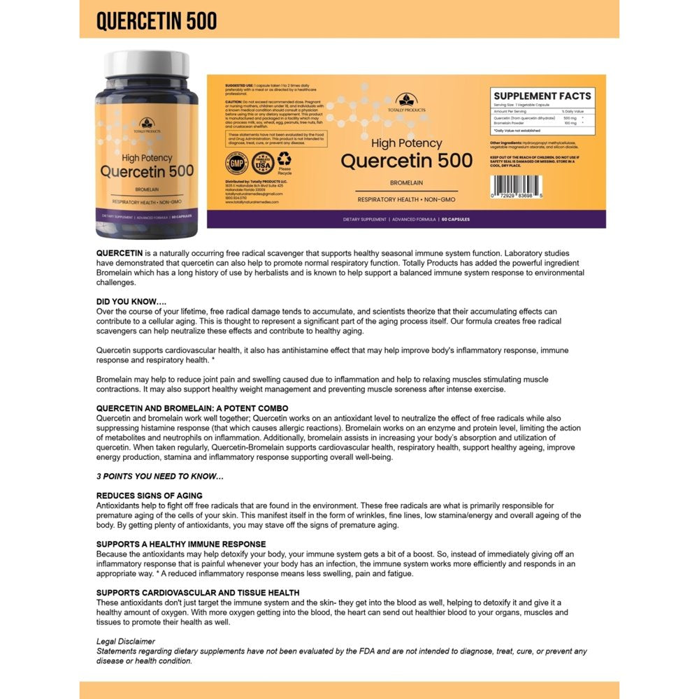 Quercetin is a naturally occurring free radical scavenger that supports healthy seasonal immune system function. Laboratory studies have demonstrated that quercetin can also help to promote normal respiratory function. Totally Products has added the powerful ingredient Bromelain which has a long history of use by herbalists and is known to help support a balanced immune system response to environmental challenges.