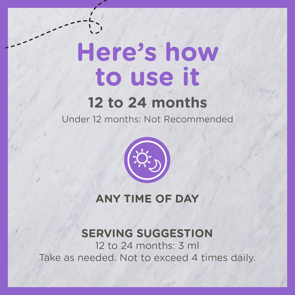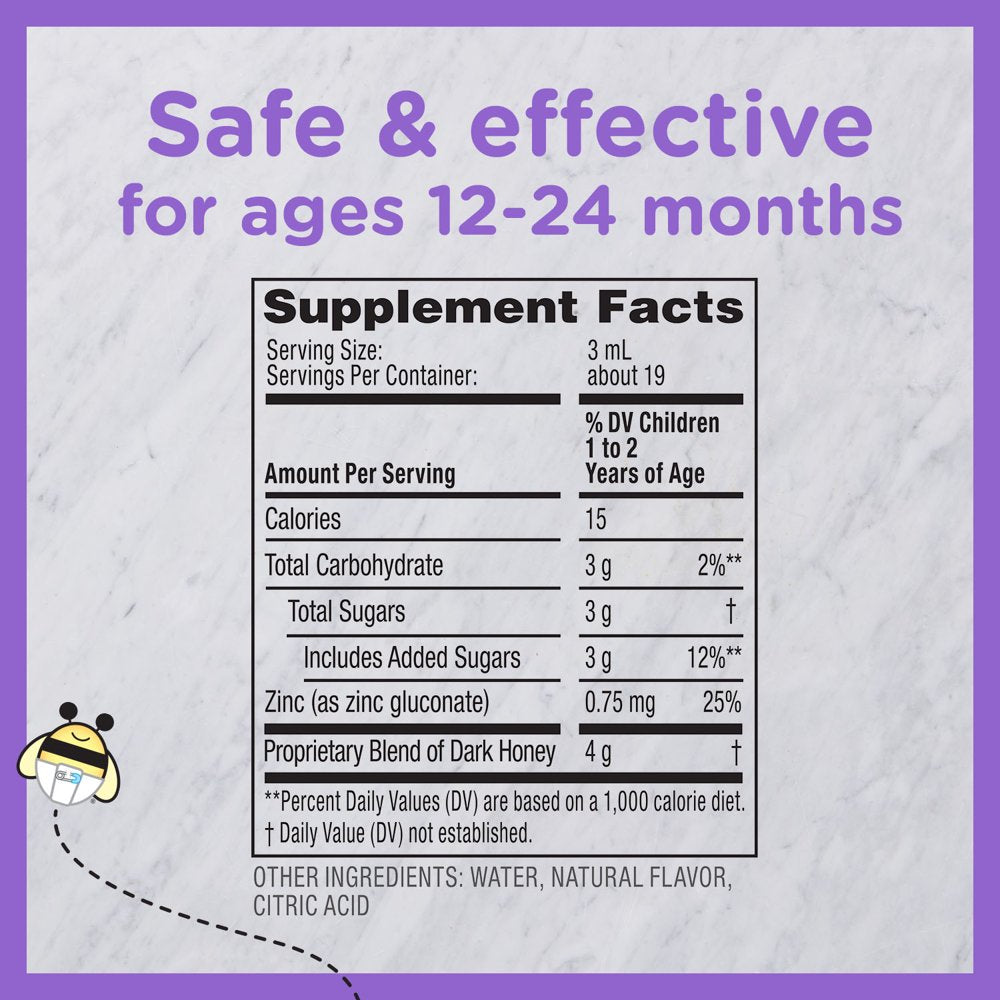 Zarbee's Complete Baby Cough Syrup + Immune with Honey is safe & effective for babies 12 months to 24 months. Our baby cough syrup is made with a special blend of dark honey to soothe coughs associated with hoarseness, dry throat, & irritants* and zinc to support the immune system*. Honey gently soothes and comforts baby’s dry throat*. This natural grape flavor cough syrup is made without drugs, alcohol, artificial sweeteners, artificial flavors, dyes, or gluten. Zarbee’s is the #1 Pediatrician Recommended Cough Syrup Brand for Babies & Kids 12 & under.Keep your hive healthy: Check out our complete range of products that are made from carefully selected ingredients inspired by nature and backed by science.*These statements have not been evaluated by the Food and Drug Administration. This product is not intended to diagnose, treat, cure, or prevent any disease.