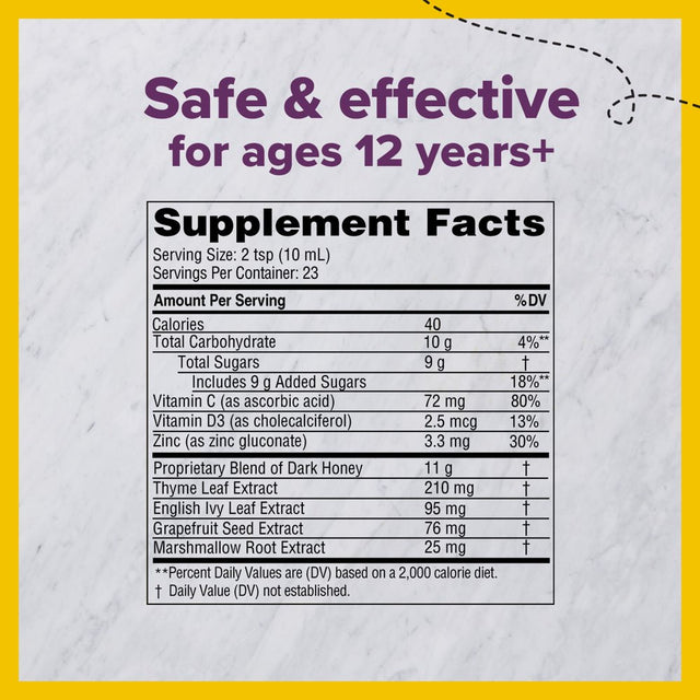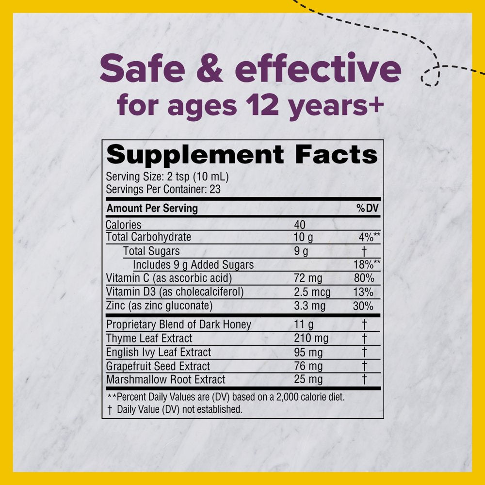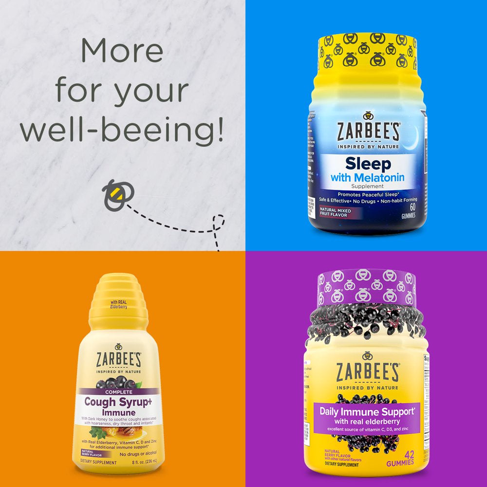 Zarbees Adult Daytime Complete Cough Syrup + Immune is a simple, safe, and effective cough syrup that is made from a proprietary blend of dark honey to help soothe coughs associated with hoarseness, dry throat and irritants.* This syrup contains zinc, vitamins C & D, minerals & elderberry for immune support to help you feel your best.* Our Cough Syrup + Immune is made from carefully selected ingredients inspired by nature - free of drugs, alcohol, artificial sweeteners, artificial flavors, and gluten. Our great-tasting, natural berry flavor syrup is safe & effective for adults and kids 12 years+. Check out our complete range of products that are made from carefully selected ingredients inspired by nature and backed by science. *These statements have not been evaluated by the Food and Drug Administration. This product is not intended to diagnose, treat, cure, or prevent any disease.