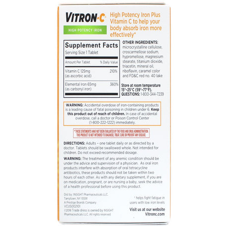 Vitron-C High Potency Iron Supplement, Immune Support, 125Mg Vitamin C, 60 Count
