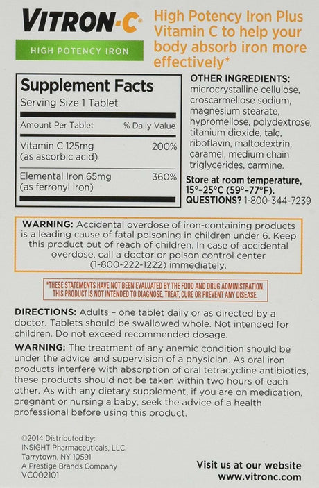 Vitron-C High Potency Iron with Vitamin C Supplement, 60 Ct, 2 Pack