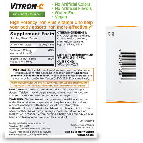 Vitron-C High Potency Iron Supplement with 125 Mg Vitamin C, Dye Free, Vegan, Gluten Free, 60 Count