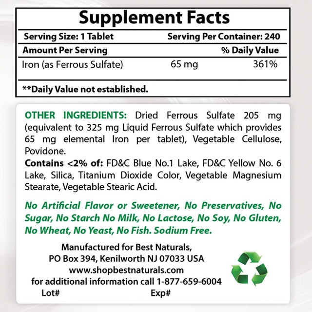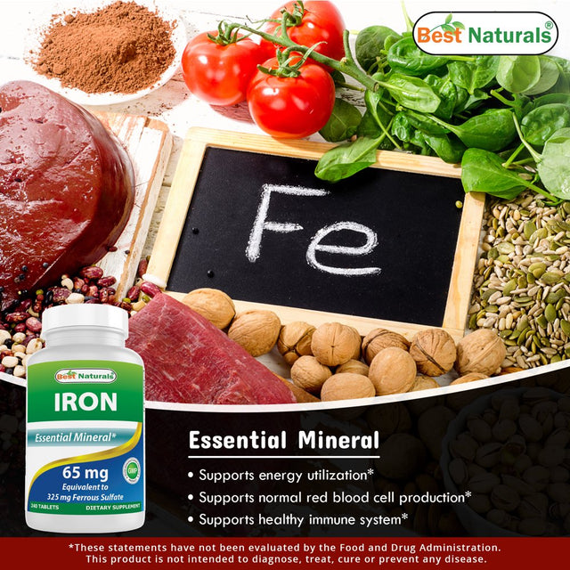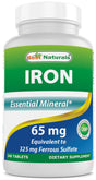 Best Naturals Iron 65 mg 240 TabletsIron is essential to nutrition because it is needed to make hemoglobin, the protein that carries oxygen in the blood. The need for iron increases during growth, menstruation, pregnancy, or when there is a loss of blood or a poor diet. Iron is an important component of hemoglobin, the protein that carries oxygen from the lungs to all body tissues and cells. Best Naturals Iron Supplement (Iron Bisglycinate) - 25mg - 180 Tablets - Gentle of Stomach - Non-Constipating.
